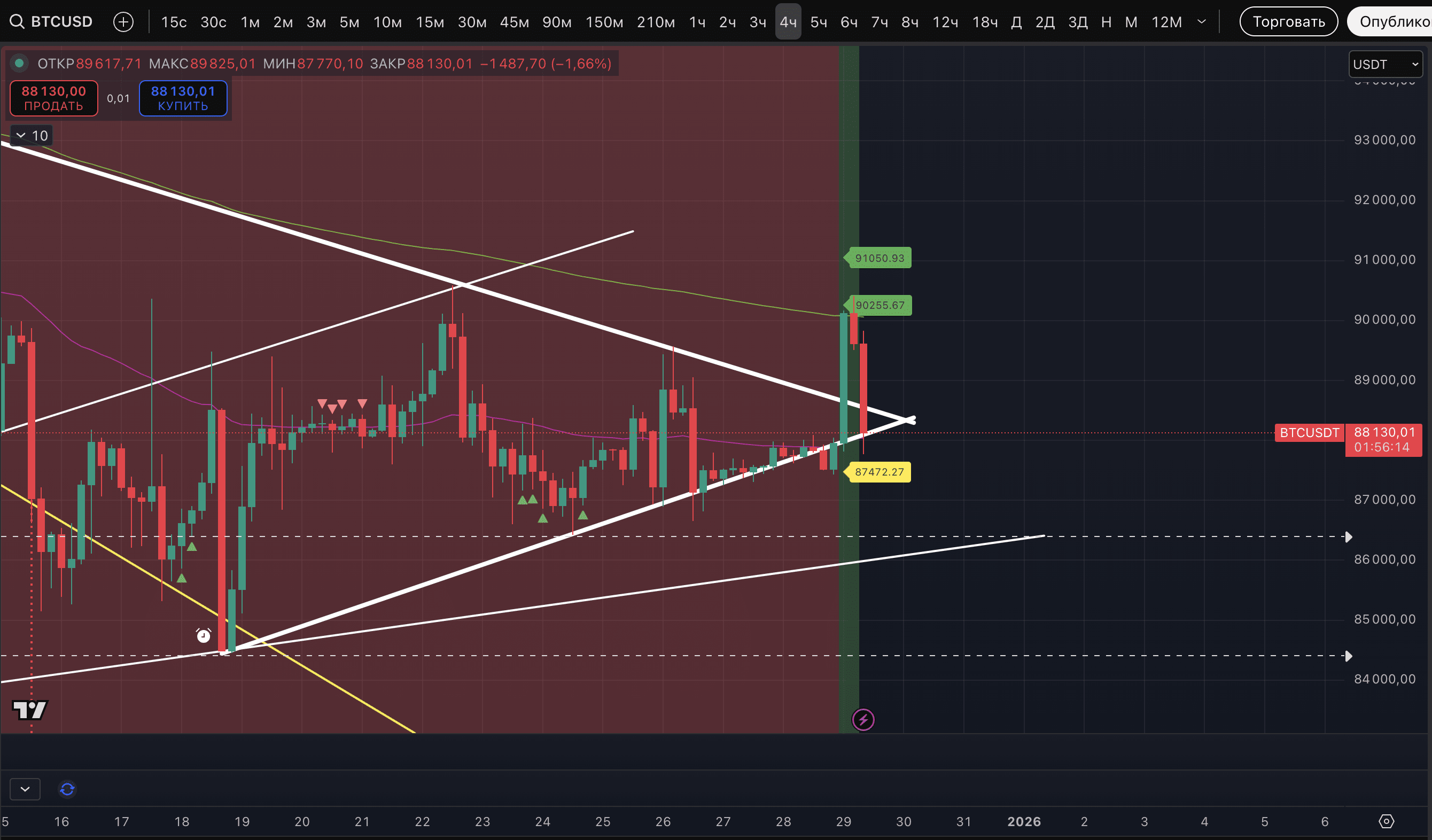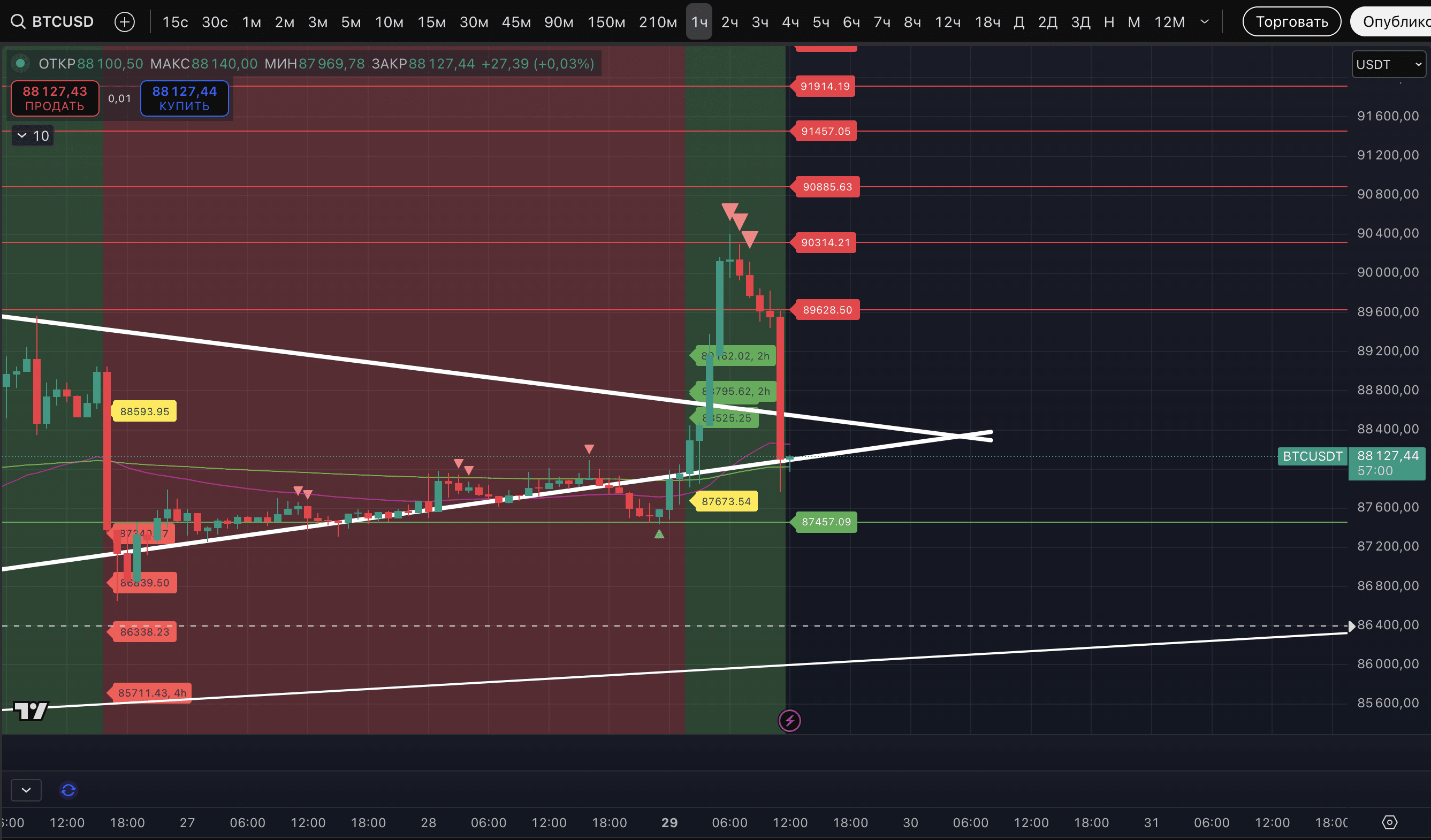 Risultati attuali del pump notturno di BTC ed ETH. Come vediamo, il segnale forte di un potenziale massimo sull'TF orario ha nuovamente funzionato chiaramente con una correzione.