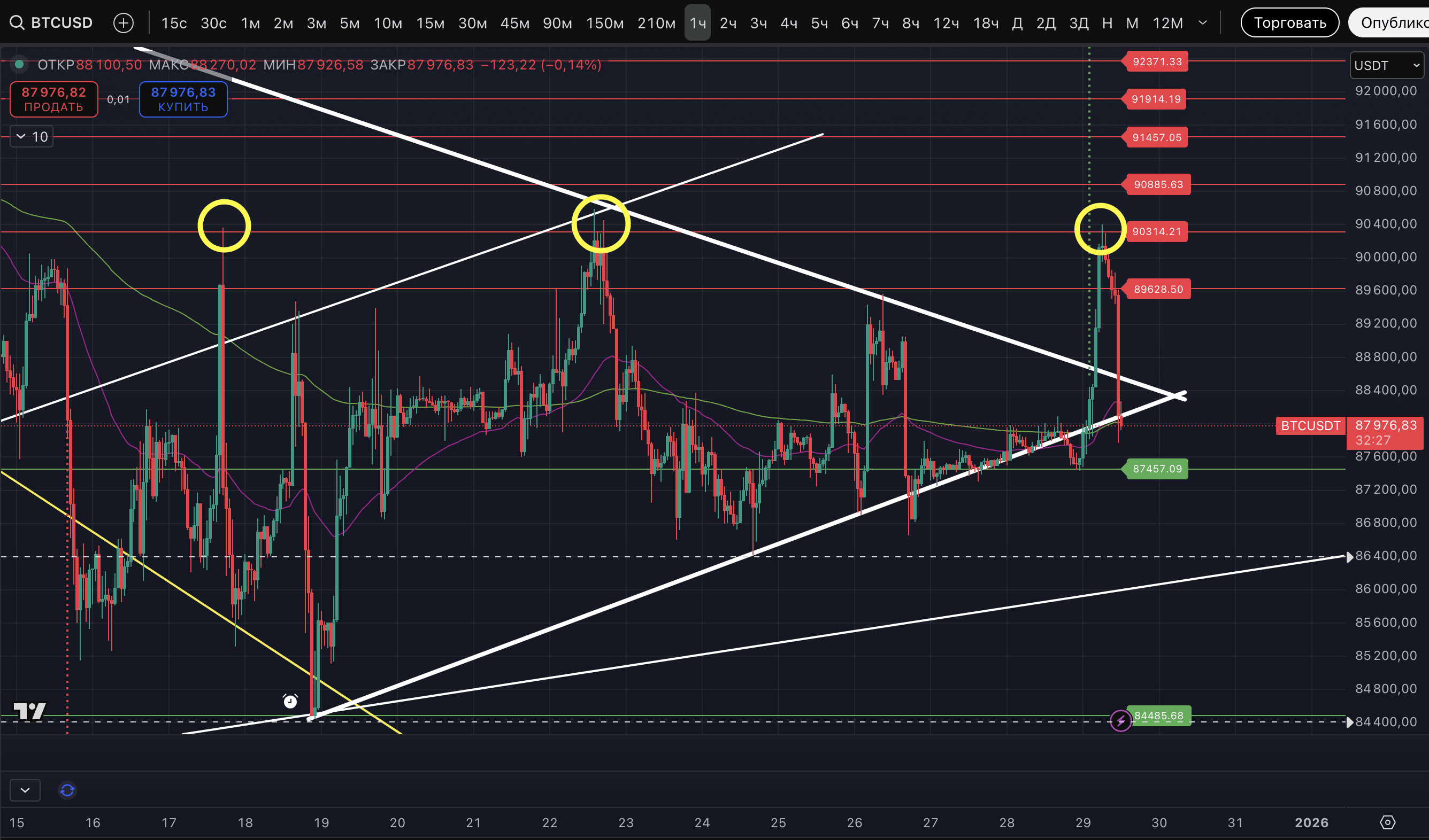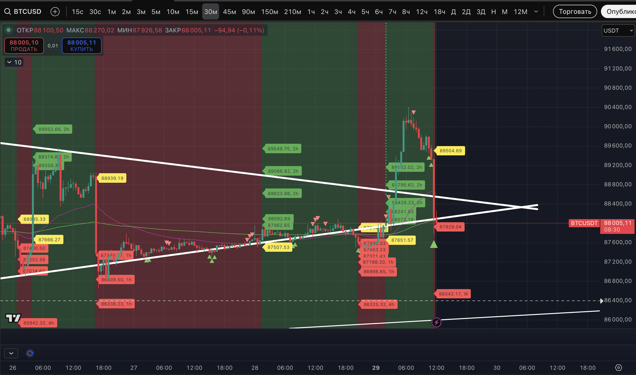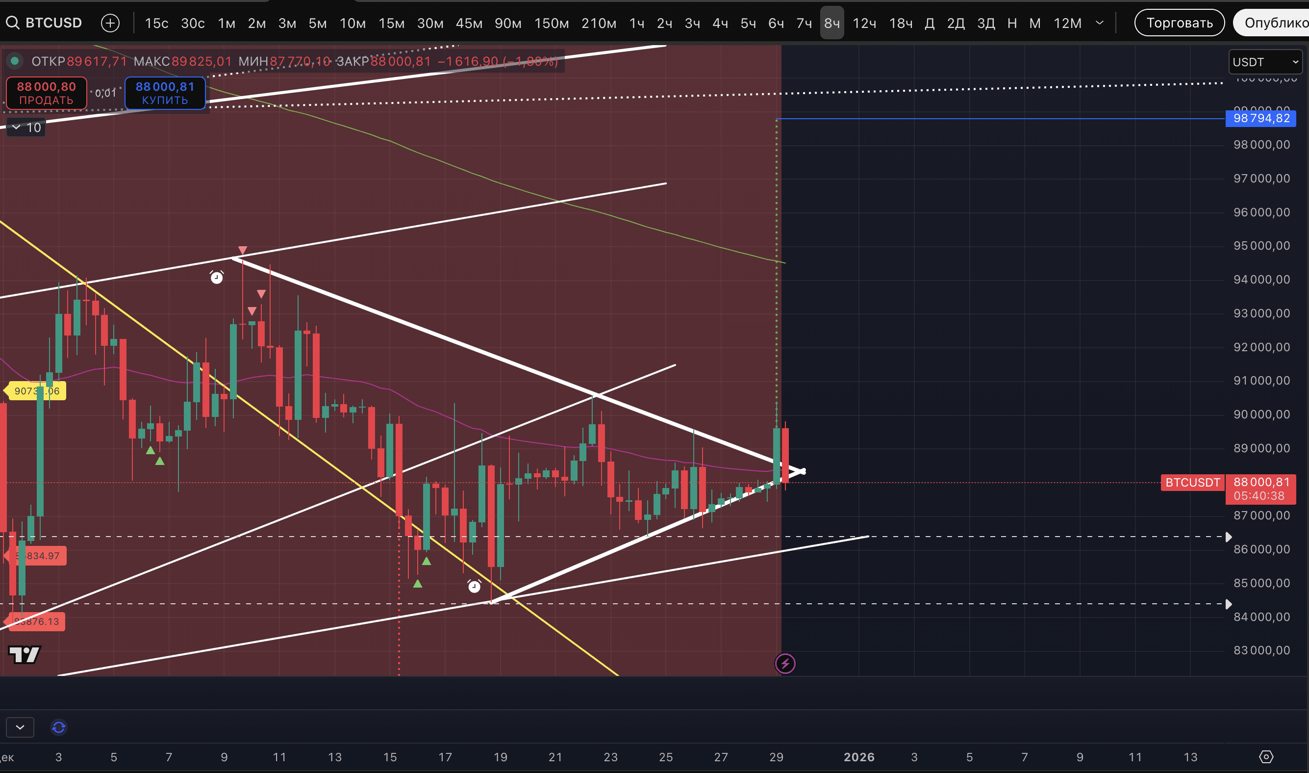 Specificamente per BTC ora - un momento cruciale, poiché il prezzo in calo dopo il pump è arrivato a livelli importanti. La diminuzione si è rivelata troppo forte e alla fine l'attivo si trova di fronte al rischio di una correzione ulteriore dopo l'assorbimento di tutto l'impulso. Soprattutto se si considera che sui livelli orizzontali il prezzo non è riuscito nuovamente a superare il limite superiore dell'intervallo di range dal 12 dicembre - 90 314$. Questo è un livello significativo, che i tori non sono riusciti a superare già tre volte - 17 dicembre, 22 dicembre e oggi, 29 dicembre. La sua rottura e il consolidamento sopra sono ESTREMAMENTE importanti per una crescita futura.