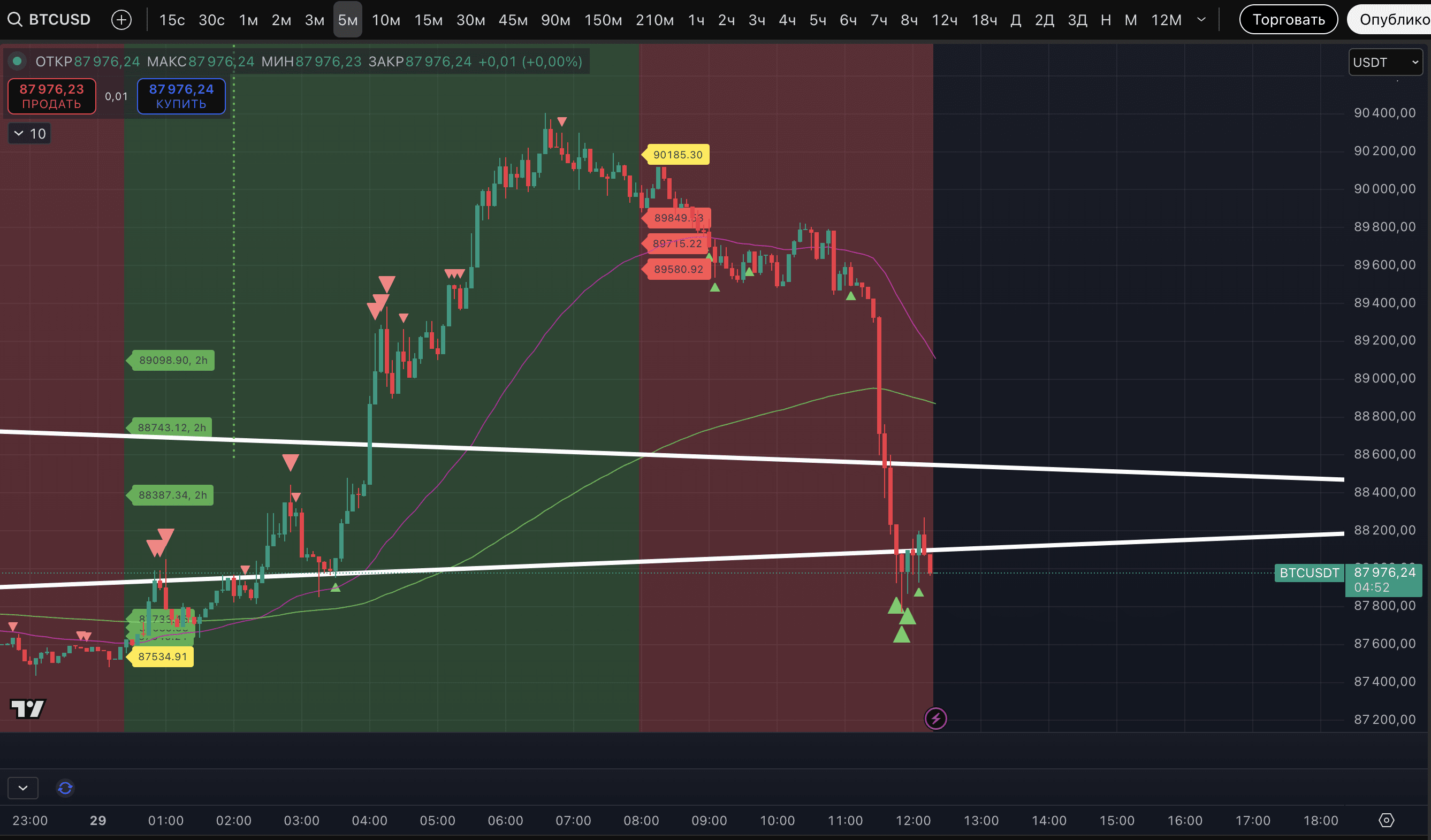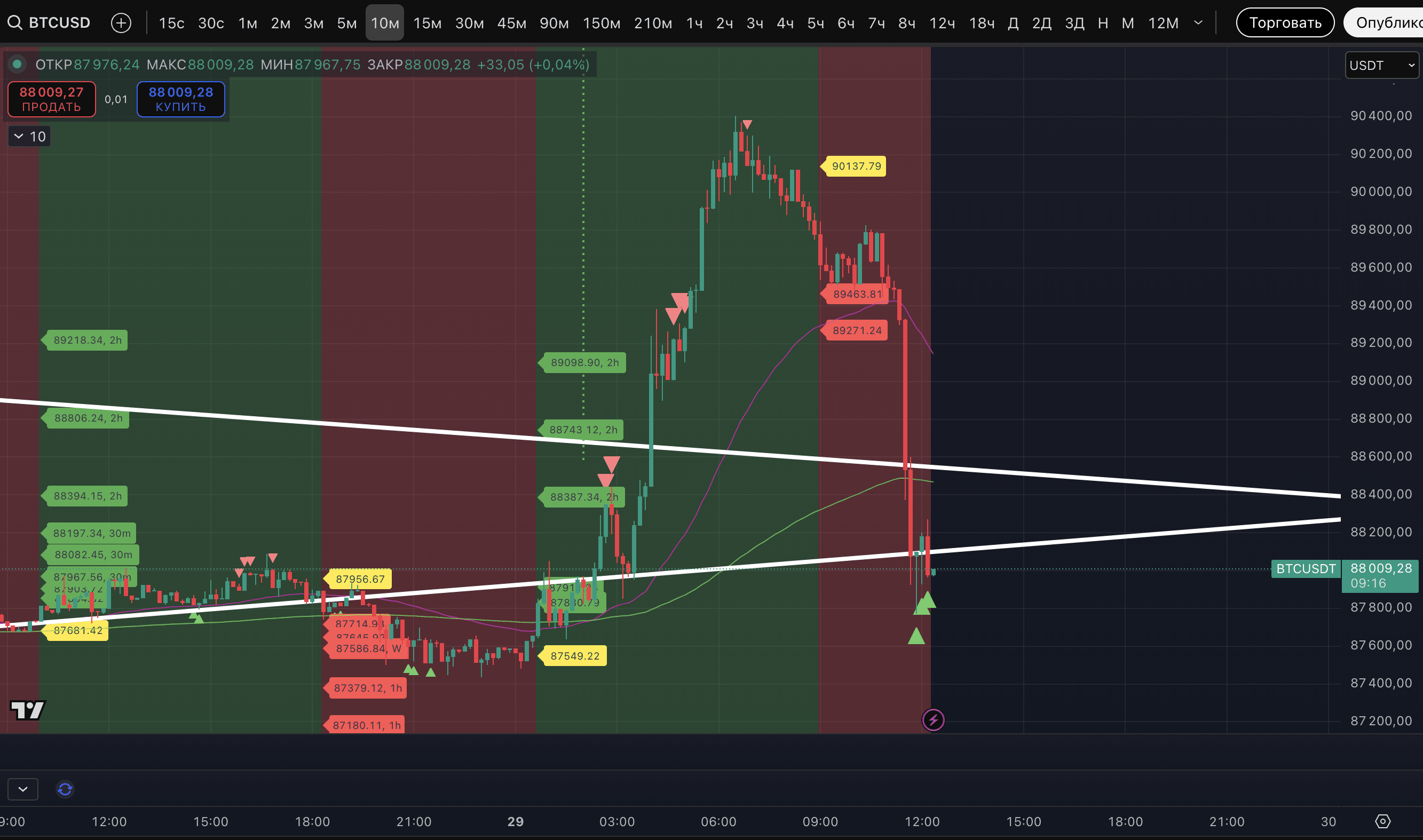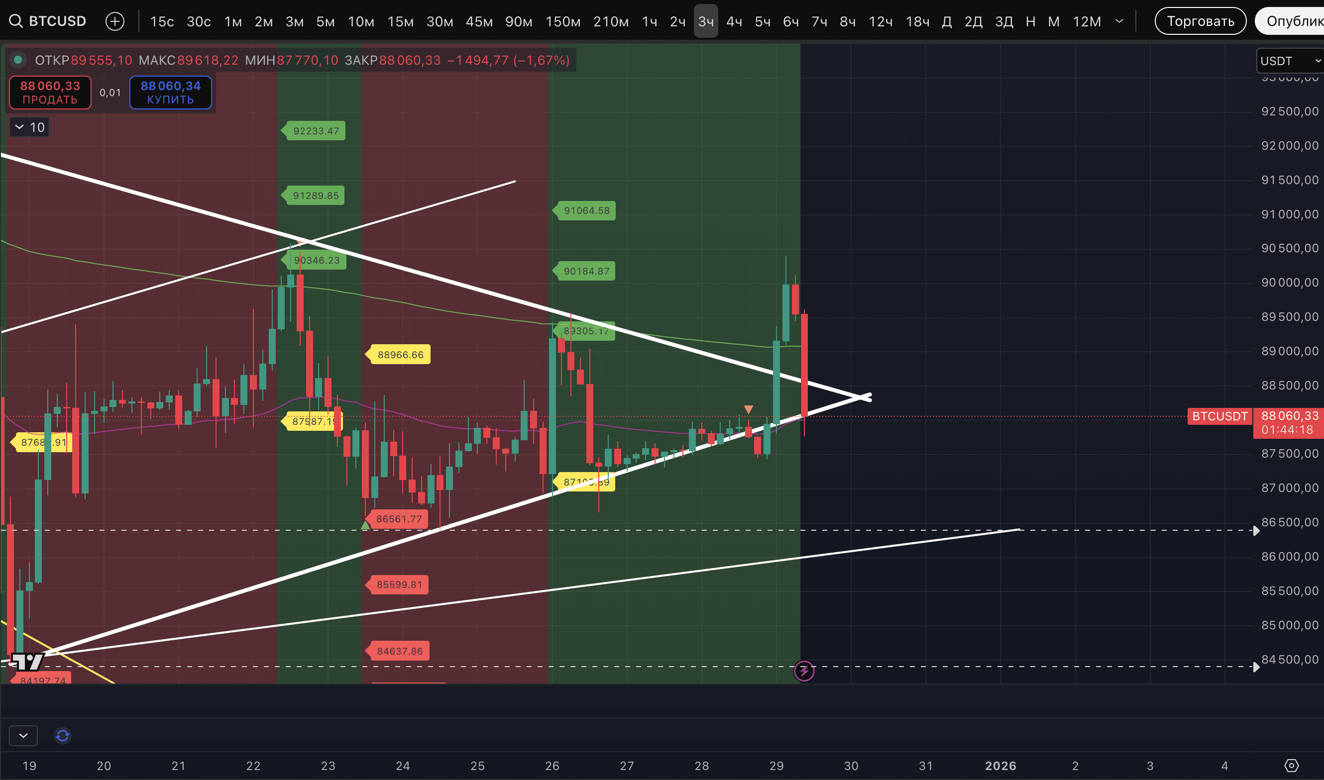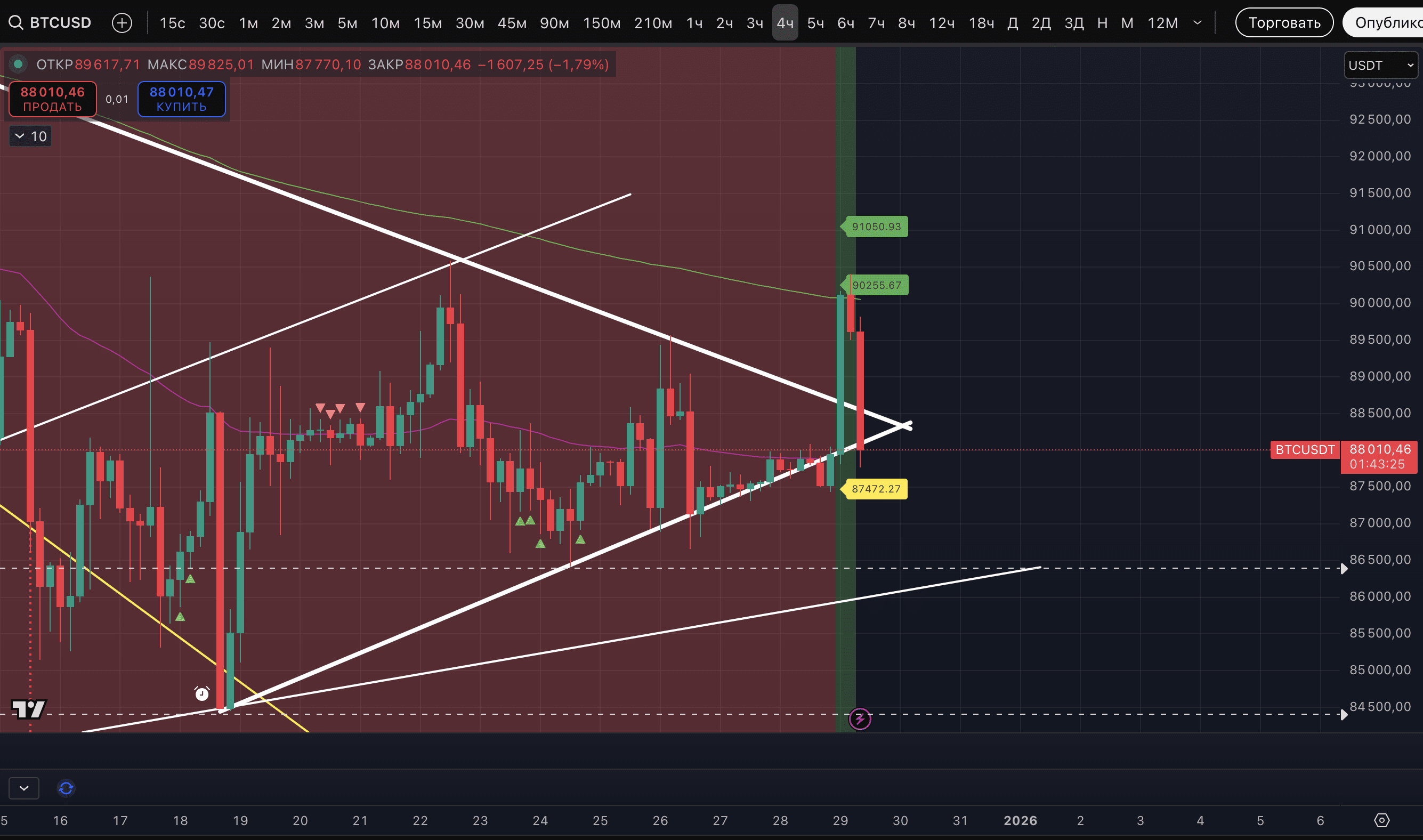 In secondo luogo, il prezzo è arrivato al test del supporto EMA 50 su timeframe di 3 ore e si è quasi avvicinato al livello di potenziale rottura del trend rialzista su timeframe di 4 ore (87 472$).