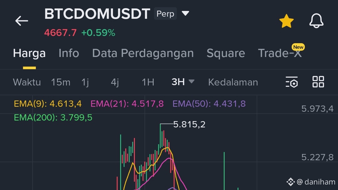 La Dominanza BTC (BTCDOM) nel timeframe di 3 ore sta attualmente mostrando una struttura rialzista lieve, supportata dal fatto che l'azione dei prezzi rimane sopra le EMA 9, 21 e 50. Questo indica che Bitcoin mantiene ancora forza a breve termine rispetto agli altcoin.