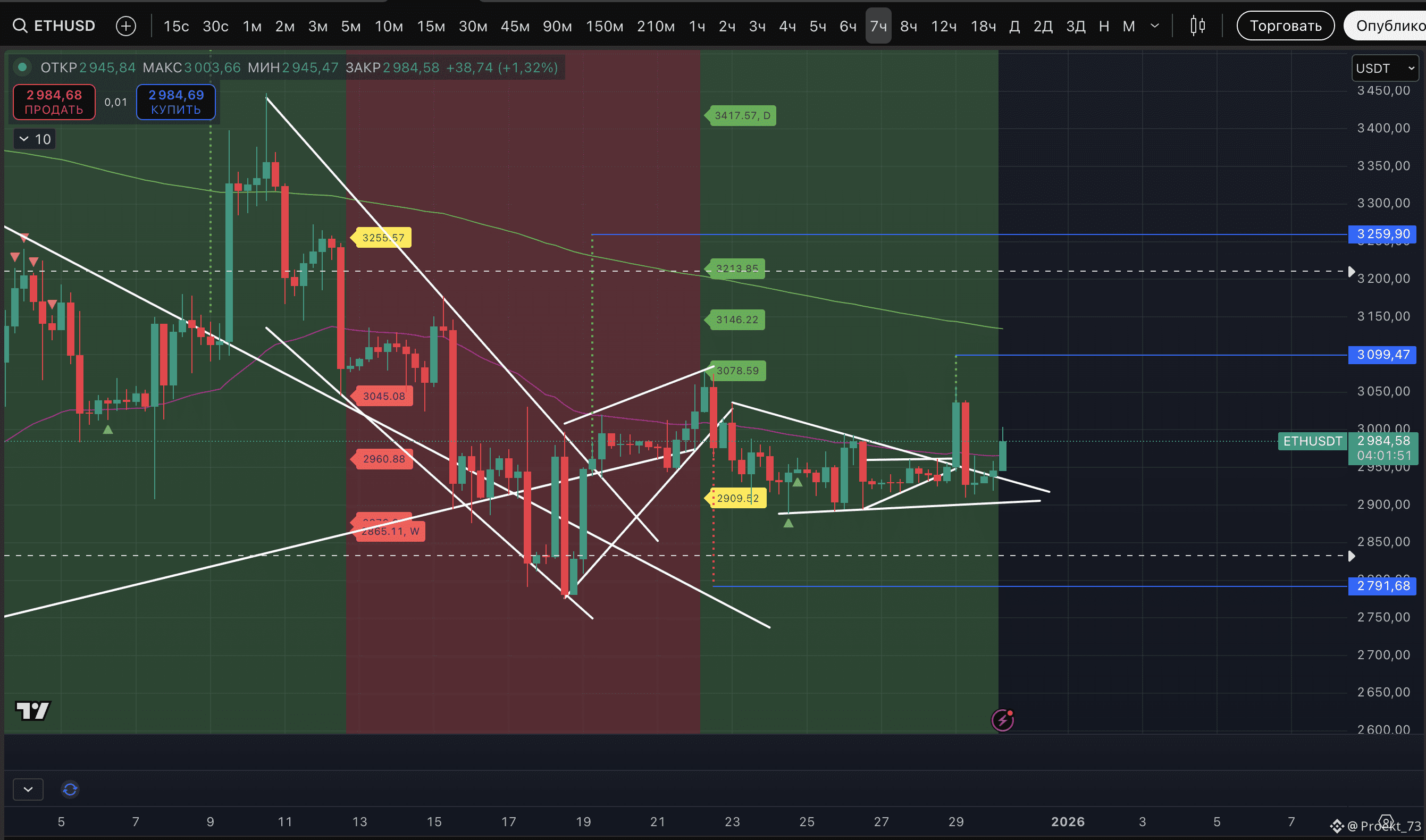 UPD по ETH на утро 30 декабря. За время коррекции вчера были удержаны уровни потенциального слома аптрендов на 3- и 4-часовом ТФ по нашему индикатору. Напомним, это 2 924$ и 2 925$ соответственно.