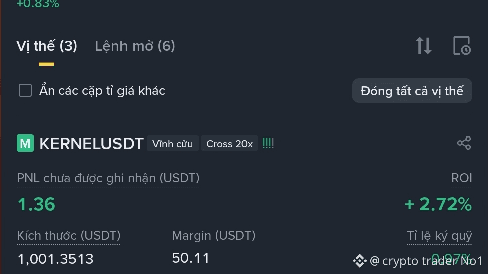 In questo ordine $KERNEL ae nota che fin dall'inizio ho impostato lo SL molto vicino all'Entry, ma sono comunque molto tranquillo; fino ad ora sono passate mezza giornata e si mantiene stabile con una tendenza al rialzo. Aspetterò che superi la zona di resistenza sopra per spostare lo SL all'Entry e proteggere l'ordine. Questa è anche una lezione importante per me: prima di pensare al profitto, bisogna assicurarsi che l'ordine sia sicuro.