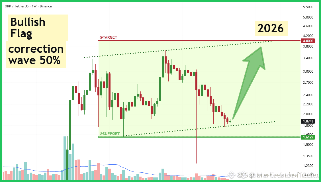 $XRP's Weekly chart is confirming a classic Bullish Flag pattern, bouncing perfectly off the lower trendline support around $1.87. This deep correction looks ready for a major breakout move targeting previous high levels.