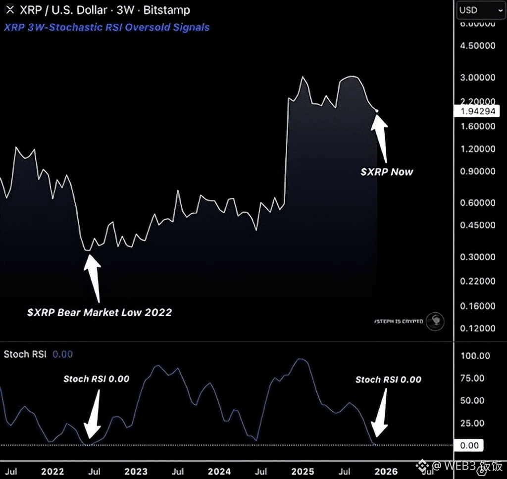 XRP 在3 周级别图表上的随机相对强弱指数(Stochastic RSI),已经跌到了 0.00。