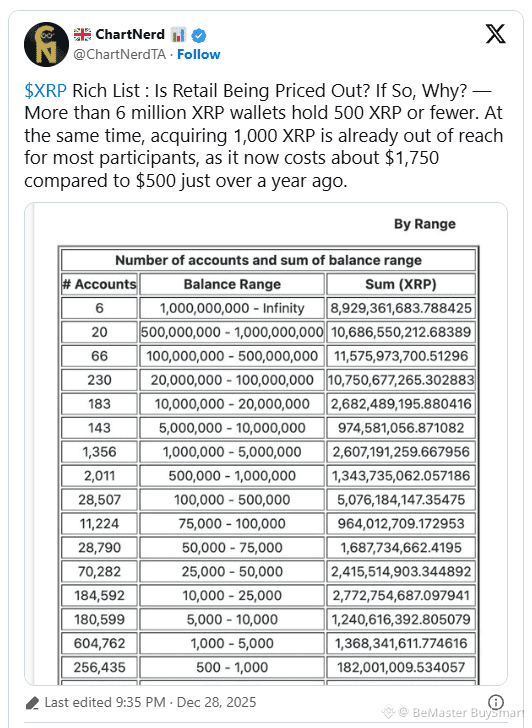 ChartNerd ha scritto che “Più di 6 milioni di portafogli XRP detengono 500 XRP o meno.” Ha aggiunto che “acquisire 1.000 XRP è già fuori portata per la maggior parte dei partecipanti, poiché ora costa circa $1.750 rispetto a $500 di poco più di un anno fa.” Il post ha abbinato questa osservazione a un grafico dettagliato sulla distribuzione del saldo che mostra come si raggruppa l'offerta di XRP tra le dimensioni dei portafogli.