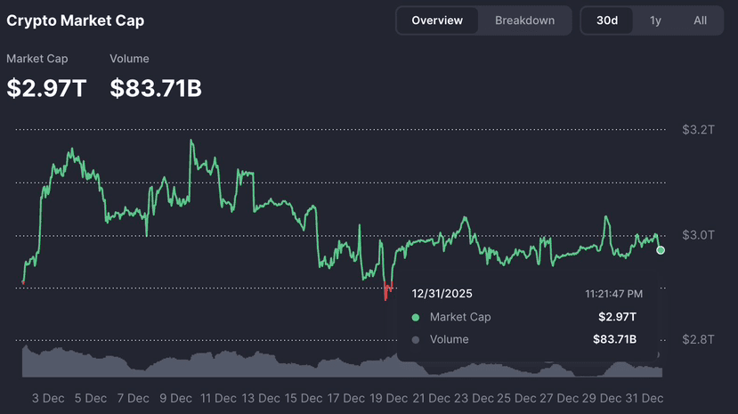 Il mercato delle criptovalute chiude il 2025 con una massiccia capitalizzazione di mercato di $2.97 TRILIONI, mostrando una forte crescita e adozione globale.