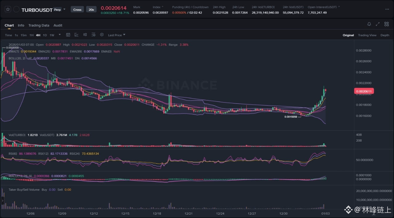 The attached 4-hour chart for TURBO/USDT illustrates a decisive transition from a low-volatility accumulation phase to a high-volatility expansion phase. For several weeks, the asset traded within a tight horizontal range, roughly between 0.0016 and 0.0017 USDT. This period was characterized by contracting Bollinger Bands and flattening Exponential Moving Averages (EMAs), signaling a drying up of liquidity and a balance between buyers and sellers. However, recent sessions have shattered this equilibrium. The asset has surged to trade above the 0.0020 level, representing a substantial percentage gain in a short timeframe. This move is accompanied by a visible expansion in trading volume, suggesting that the breakout is backed by genuine market participation rather than low-liquidity manipulation. The current market structure is unequivocally bullish in the immediate term, though the velocity of the move raises questions regarding sustainability and the potential for mean reversion.