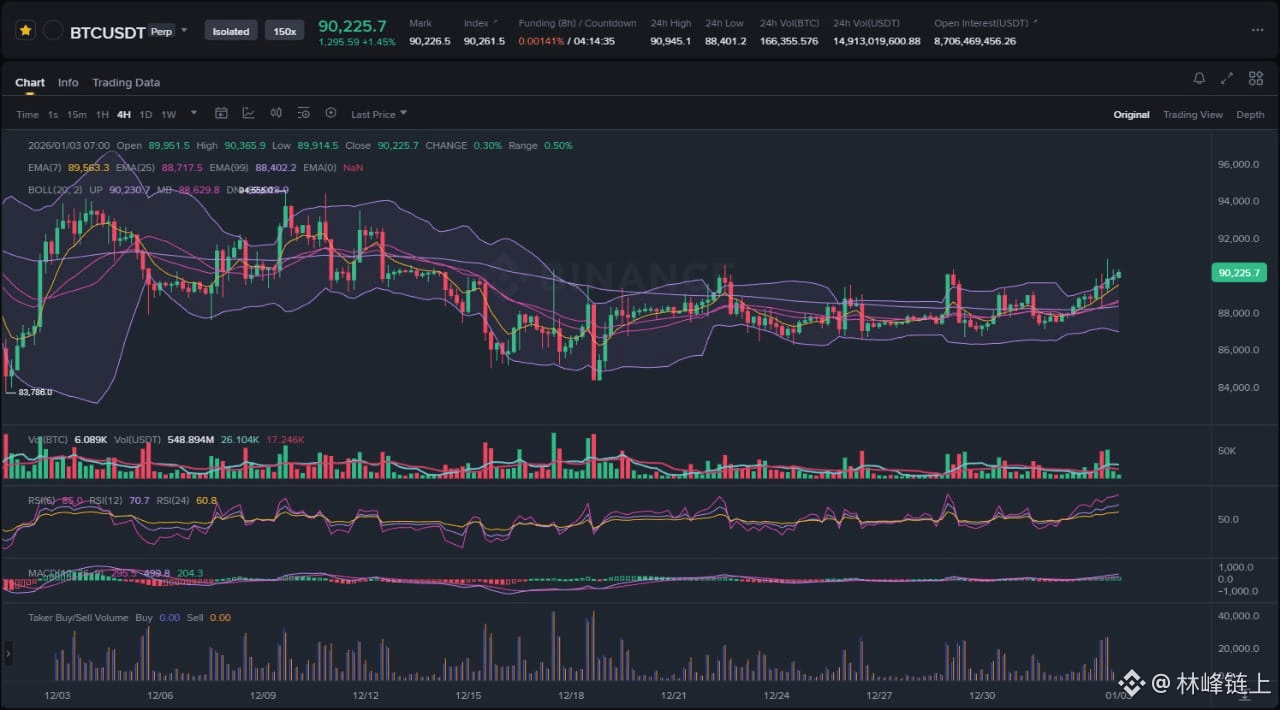 The attached 4-hour chart for the BTC/USDT Perpetual contract illustrates a market in transition. After a period of downward pressure and consolidation throughout mid-to-late December, price action has begun to coil and push upward. The asset is currently trading at 90,225.7 USD, marking a modest but significant recovery from the local lows established in the 84,000 USD to 85,000 USD region. The immediate market structure suggests a shift from distribution to a tentative accumulation phase, characterized by higher lows and a compression of volatility that is now beginning to expand. This price action is occurring against a backdrop of mixed signals, where on-chain metrics and technical indicators are signaling strength, while broader market sentiment remains cautious due to historical cycle concerns.