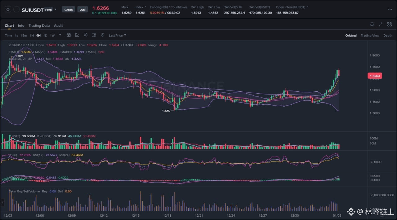 At the time of this analysis, SUI is trading near the 1.6266 mark, representing a significant recovery from recent lows. The market structure has shifted from a defensive, range-bound posture to an aggressive expansion phase. The 4-hour chart captures a classic transition from low volatility to high volatility, a hallmark of trend initiation. The price action is currently challenging overhead supply zones, with the immediate focus on sustaining the momentum generated over the last 48 hours. The broader market context remains essential, but SUI is displaying relative strength, decoupling from the lethargy seen in some legacy altcoins. The current valuation reflects a market that is pricing in both short-term speculative demand and long-term utility value, specifically tethered to the protocol's scalability and upcoming feature set.