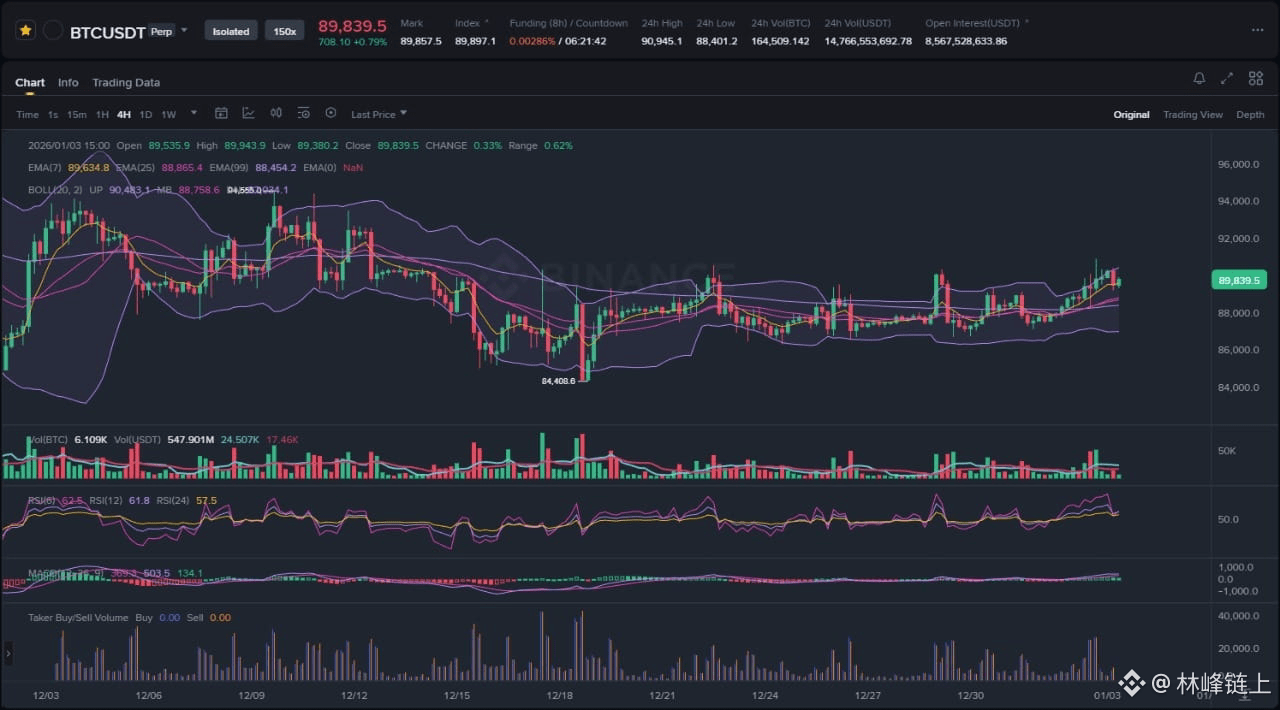 The perpetual futures chart for BTCUSDT shows Bitcoin trading in a broad range throughout late December 2025 into early January 2026, with price consolidating between approximate lows near $84,000 and highs around $92,000–$94,000 earlier in the period. Recent sessions reveal a sharp decline followed by a partial recovery, culminating in a push back toward the upper range boundary. Volume profiles indicate elevated activity during the downside move, while the latest candles show reduced selling intensity on the rebound. Momentum indicators remain mixed, with RSI hovering in neutral territory and MACD displaying weakening bearish divergence.
