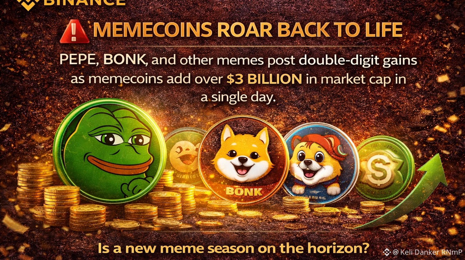 Token come PEPE, BONK e diversi altri hanno registrato guadagni a due cifre, spingendo il capitale di mercato totale dei memecoin a salire di oltre 3 miliardi di dollari in un solo giorno.