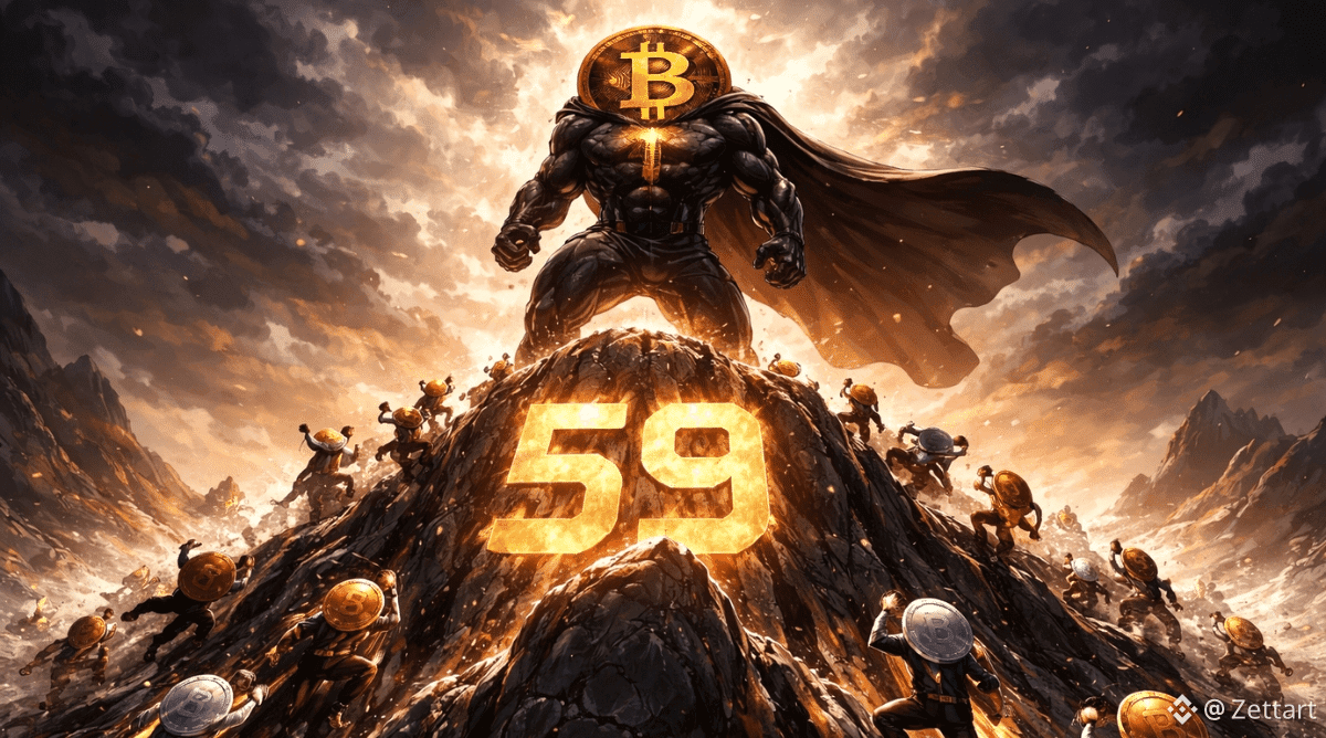 Una figura imponente, con un mantello $BTC , si erge su una cima rocciosa contrassegnata dal numero luminoso 59 mentre le altcoin più piccole salgono verso l'alto sotto un cielo drammatico e tempestoso.