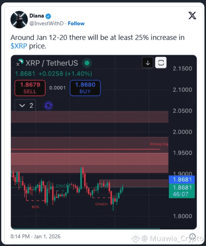At the time of Diana’s analysis, XRP traded at $1.8681. A 25% increase will send it to $2.335, its highest level since mid-November. The analysis stays focused on structure, levels, and timing. The January 12-20 window appears connected to the compression under resistance rather than to a specific event.