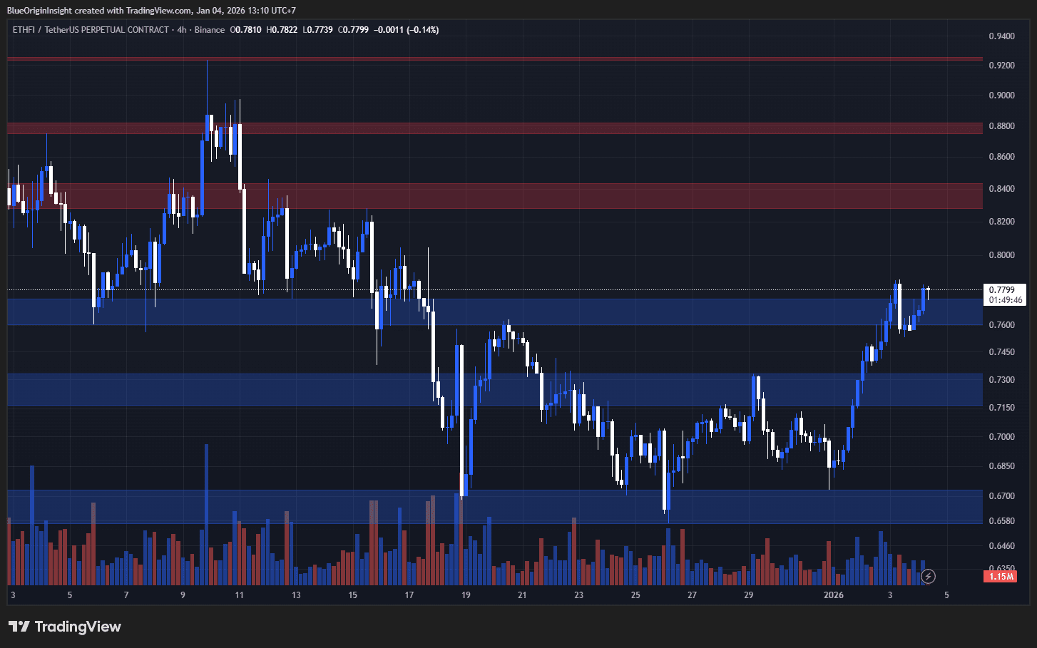 $ETHFI sta scambiando intorno a 0.765, mantenendosi sopra il range medio della recente struttura un segnale costruttivo dopo il minimo locale a 0.657.