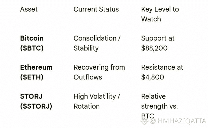 Why STORJ? As Bitcoin and Ethereum lead on the institutional front, mid-cap utility tokens like STORJ often see spikes in volatility. With Bitcoin holding its support at $88k–$90k, the "altcoin season" mechanics are beginning to trigger, as capital seeks higher returns than the now-stable "digital gold."