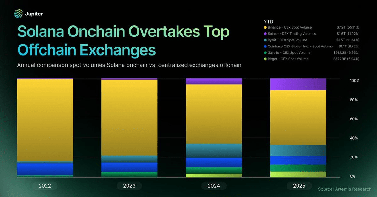 Riepilogo del contenuto: cambiamento nella struttura degli scambi su blockchain/ecosistema delle blockchain. I dati di Jupiter (riportati da diverse testate) mostrano che nel 2025 il volume di scambi spot su blockchain di Solana è stato di circa 1,6 trilioni di dollari, con una quota di mercato passata dal 1% nel 2022 a circa il 12%, superando principali CEX come Bybit, Coinbase e Bitget, e posizionandosi al secondo posto dopo Binance.