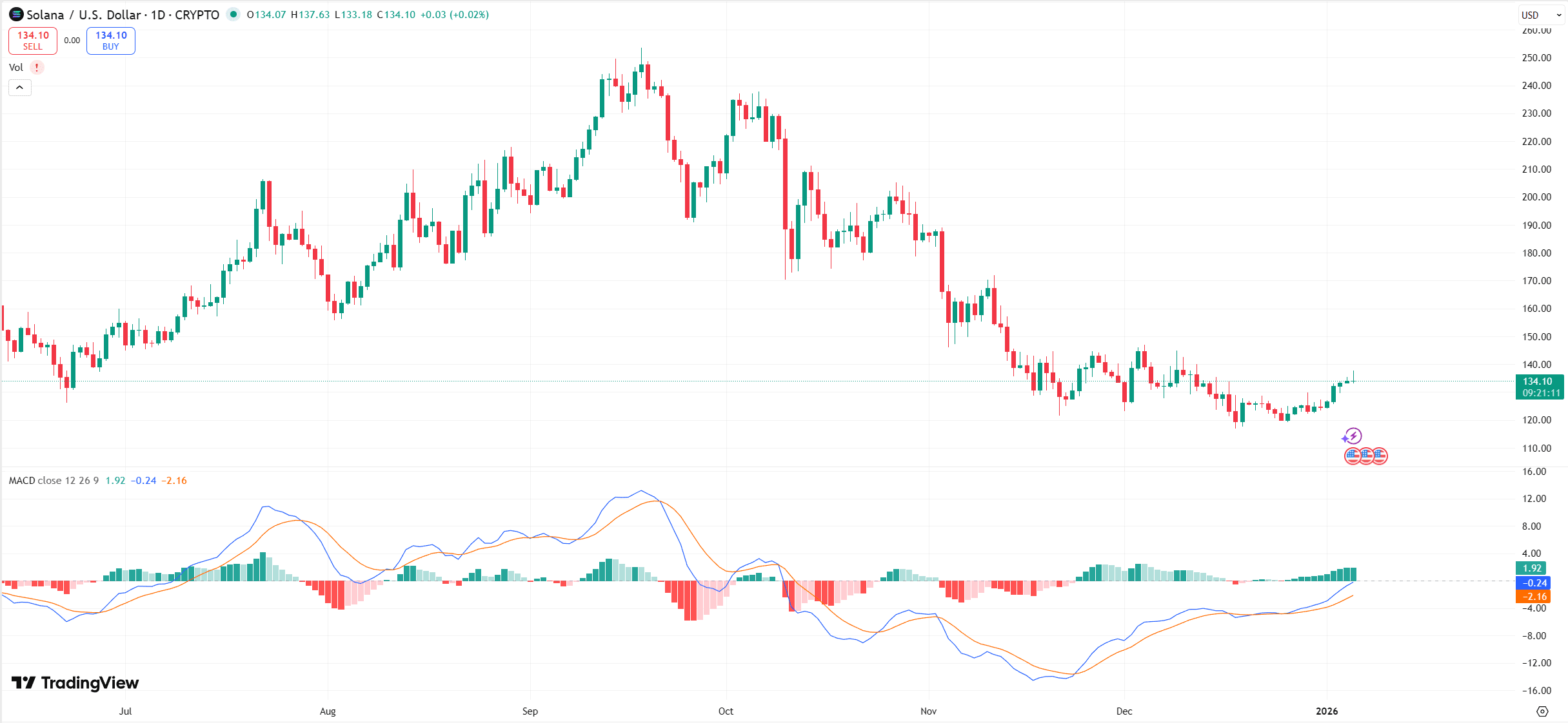 Fino alle 22:40 del 5 gennaio, SOL è a circa 134,1 dollari, +0,0.2% nelle ultime 24 ore