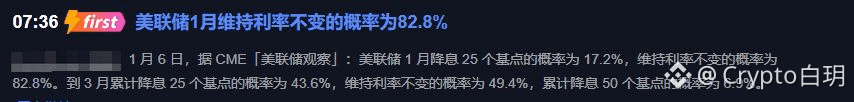 1月份: 降息概率只有17.2%,而维持利率不变的概率高达82.8%。啥意思?就是美联储这个月几乎不可能降息,大家别瞎期待了。