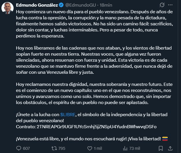 Lo schema è stato promosso tramite un account hackerato di Edmundo González, considerato da molti il leader legittimo del paese — conferendo così allo scam un'immagine di credibilità immediata. 🥷