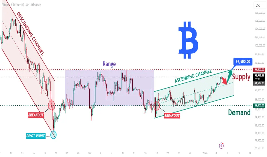Quando il prezzo è uscito dall'intervallo, Bitcoin è entrato in un canale ascendente, confermando una struttura rialzista in sviluppo. Al momento dell'analisi originale, BTC si stava avvicinando a una zona di offerta importante vicino a 94,500, un'area precedentemente associata a una forte pressione di vendita. Questo livello si allineava anche con il confine superiore del canale ascendente, aumentando la probabilità di una reazione del mercato.