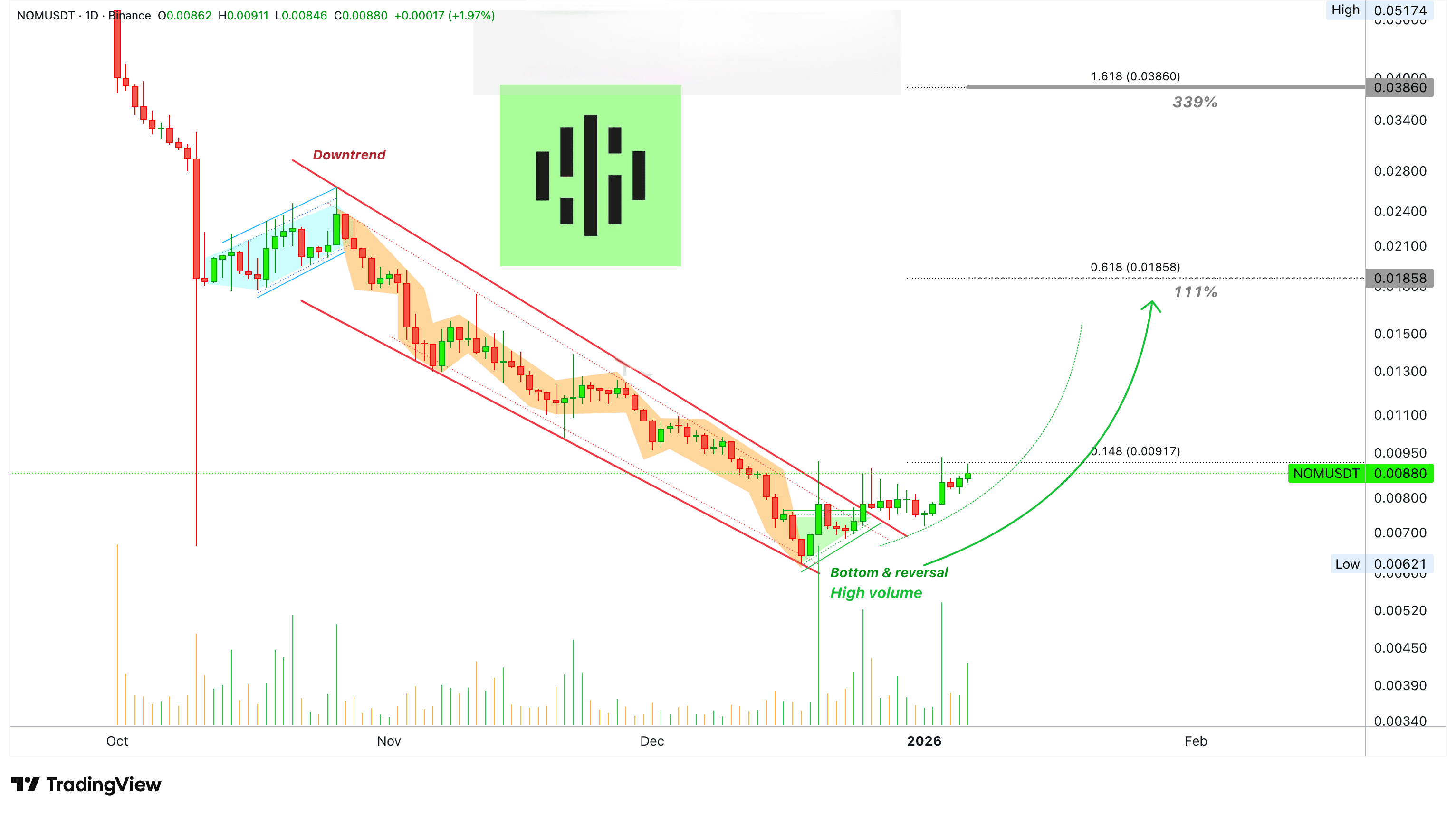 Ha un volume di trading elevato di NOMUSDT dopo un minimo storico. La resistenza è stata testata due volte. Si può prevedere una crescita aggiuntiva nelle prossime settimane, un grafico semplice.