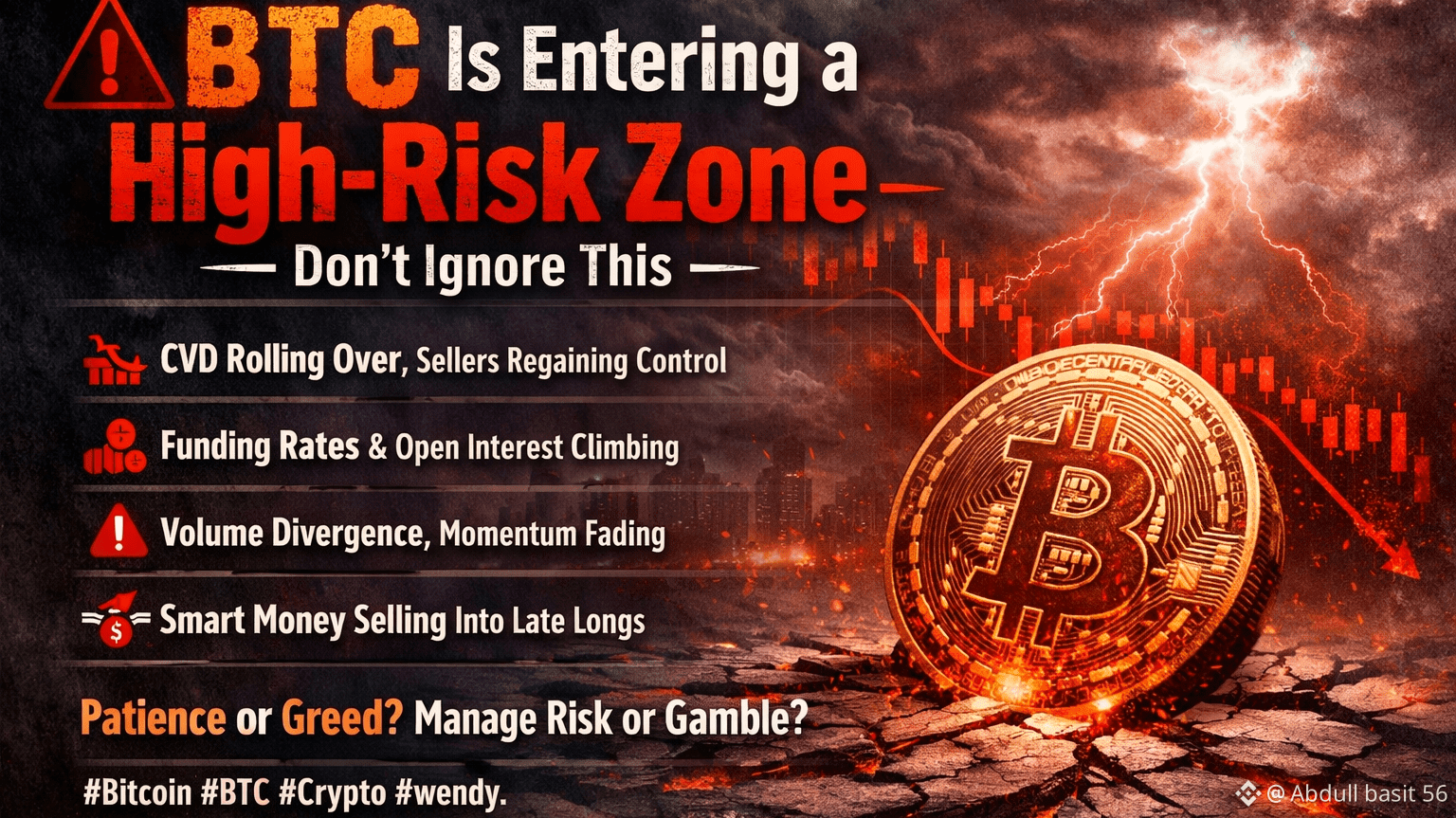 Bitcoin is showing classic divergence signals, and these setups rarely resolve quietly. CVD has rolled over, sellers are regaining control, while funding rates and open interest continue to rise — a toxic combination. This points to one clear reality: fresh longs are entering aggressively while smart money distributes into their positions.