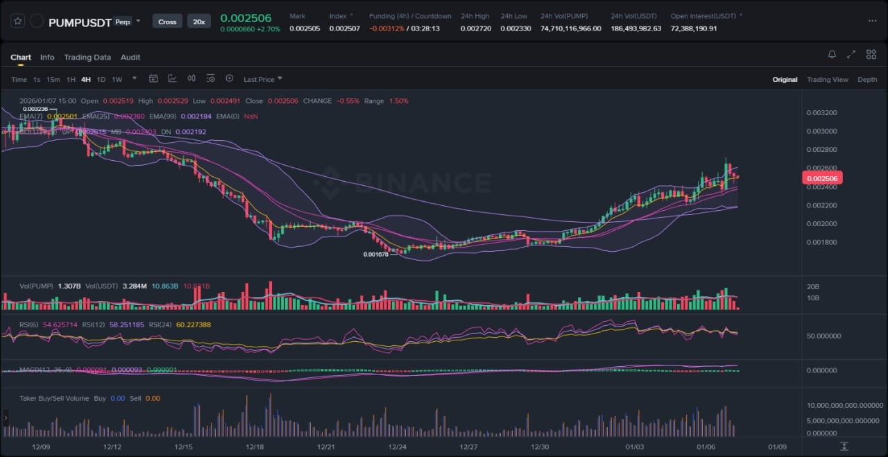 Il mercato delle criptovalute è entrato in una fase di rinnovato entusiasmo, con le memecoin che guidano la carica mentre la liquidità torna negli asset ad alta beta. La stabilizzazione di Bitcoin sopra $90,000 ha fornito un contesto macroeconomico favorevole, incoraggiando giocate speculative su piattaforme come Pump.fun. In questo contesto, PUMP, il token associato al launchpad Pump.fun e al suo DEX integrato PumpSwap, ha catturato un'attenzione significativa. I volumi di trading attraverso scambi decentralizzati basati su Solana sono aumentati, riflettendo una partecipazione più ampia da parte di investitori retail e istituzionali che cercano alpha nella frenesia delle memecoin. Il prezzo di PUMP, attualmente intorno a 0.00249, riflette questo dinamismo ma rimane sensibile ai cambiamenti di sentiment e alle conferme tecniche. Metriche chiave come l'attività on-chain e la crescita dei wallet indicano un interesse sostenuto, sebbene l'alta volatilità dell'asset—caratteristica dei derivati delle memecoin—richieda un attento monitoraggio delle zone di supporto e degli indicatori di momentum.