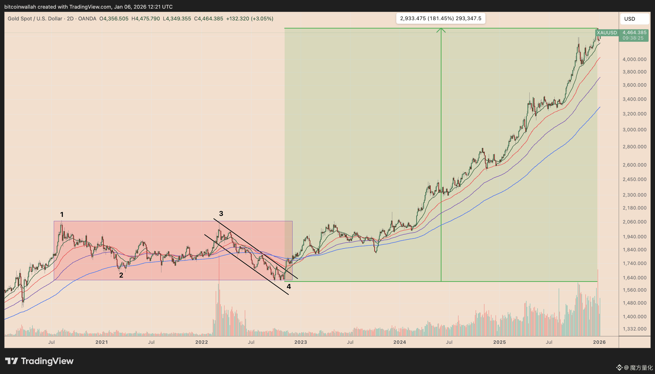 2022年11月,黄金决定性地突破其长期阻力位。随后迎来持续的扩张阶段,价格上涨约180%,并在2025年12月攀升至约4550美元的历史新高水平。