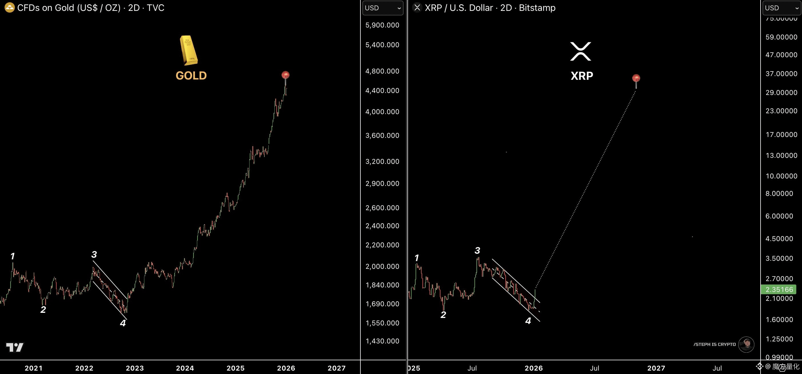 分析师Steph is Crypto指出,XRP有望在2026年复制黄金多年来的上涨趋势。
