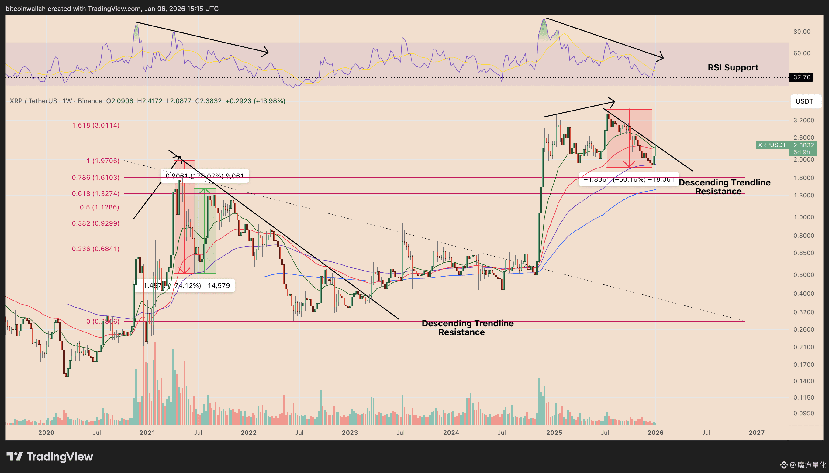 XRP当前的复苏也与其2021-2022年熊市阶段存在相似性。当时,价格上涨与相对强弱指标(RSI)下降形成了看跌背离,标志着宏观顶部,导致了85%的回调。