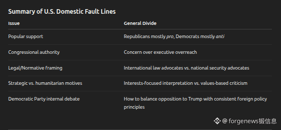 Critics (across some Democratic, independent, and academic voices) see the action as potentially undermining U.S. credibility and global law-based order.