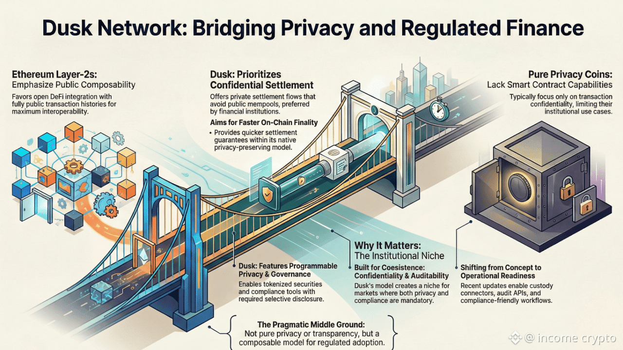Guardo a @Dusk come una catena con privacy al primo posto, progettata per essere compatibile con casi d'uso regolamentati, non come un parco giochi per massimalisti della privacy. Rispetto alle soluzioni di Ethereum layer-2, che enfatizzano una composabilità ampia e una finalità pubblica, DUSK privilegia il regolamento riservato e la divulgazione selettiva. Rispetto alle monete di pura privacy, DUSK dà priorità a una privacy programmabile che può interoperare con strumenti di governance e conformità. Questa posizione crea una nicchia per il token DUSK all'interno dei mercati in cui riservatezza e auditabilità devono coesistere.