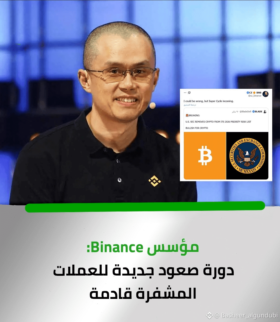 قال تشانغبينغ تشاو (#CZ )، مؤسس بورصة #Binance ، إن دورة صعود جديدة للعملات المشفّرة قادمة، مدفوعة بـتغيّر جذري في الموقف التنظيمي للولايات المتحدة تجاه الأصول المشفرة، واقتراب إقرار قانون شامل لتنظيم سوق الكريبتو.