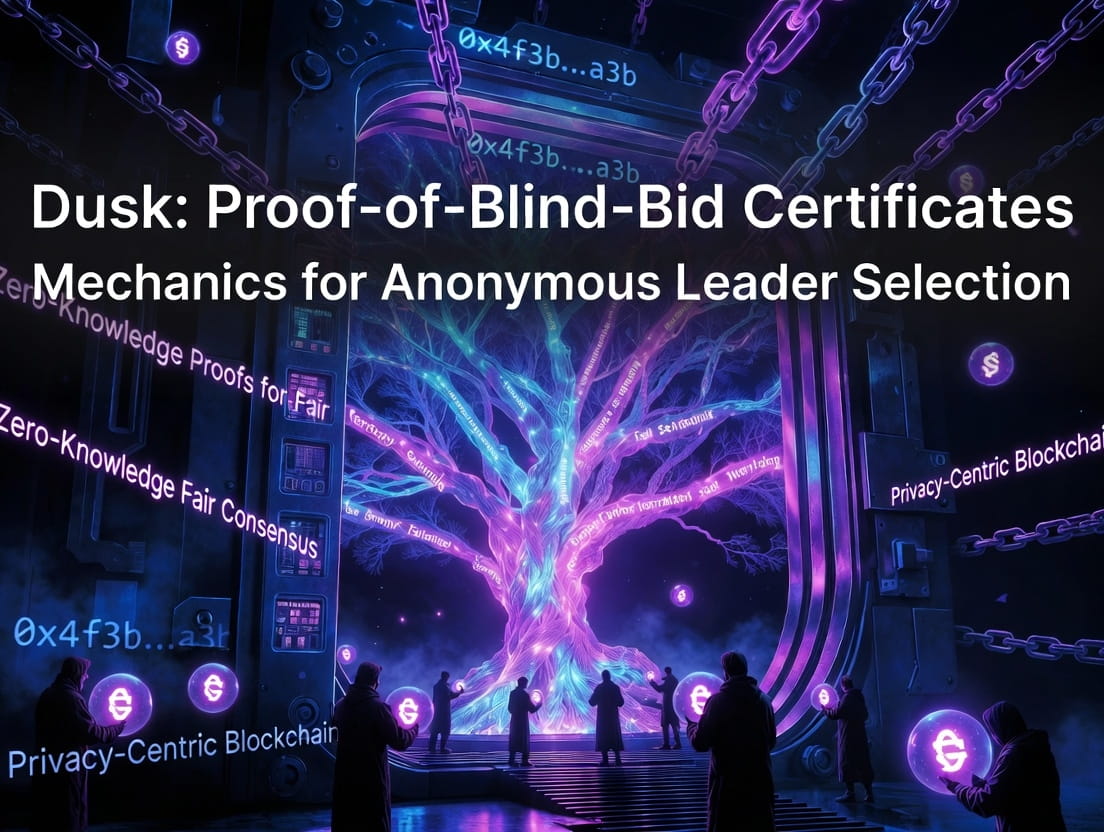 PoBB is essentially Dusk's way to select block leaders without exposing participants to risks like DDoS attacks on known high-stakers. Imagine a secure vault with hidden compartments: each participant locks away a bid (their staked DUSK amount committed via Pedersen hashes) into a shared Merkle Tree structure. The bid includes elements like a commitment c = C(v, b) where v is the stake value, a secret hash, and eligibility heights.