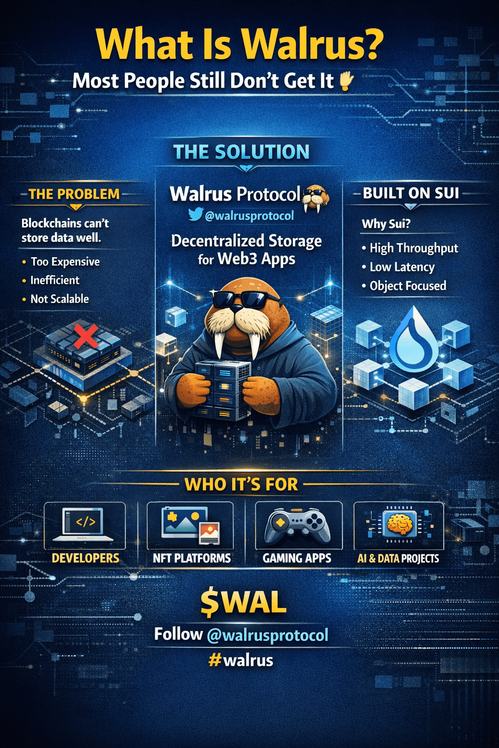 Walrus è un protocollo decentralizzato di archiviazione dati progettato per memorizzare e fornire dati su larga scala in modo affidabile per le applicazioni Web3.