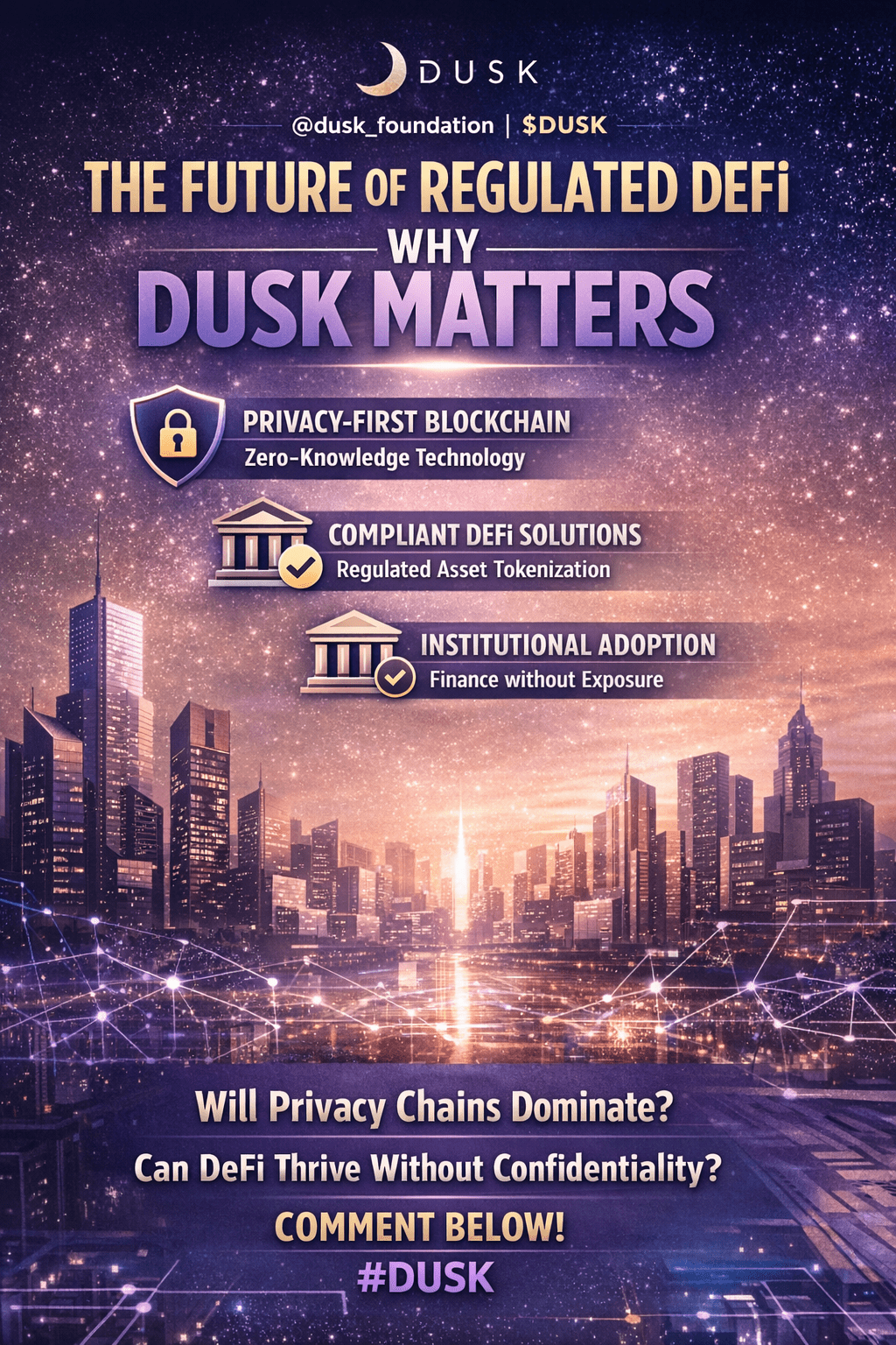 Dusk è una blockchain Layer-1 incentrata sulla privacy, progettata appositamente per la finanza decentralizzata regolamentata. Piuttosto che aggiungere la conformità in un secondo momento, è stata integrata direttamente nel protocollo tramite crittografia a conoscenza zero. Questo approccio consente alle transazioni, all'emissione di asset e ai contratti intelligenti di rimanere riservate, pur rimanendo completamente verificabili. In sintesi, le istituzioni possono operare in rete senza trasmettere dati finanziari sensibili a tutti gli altri.