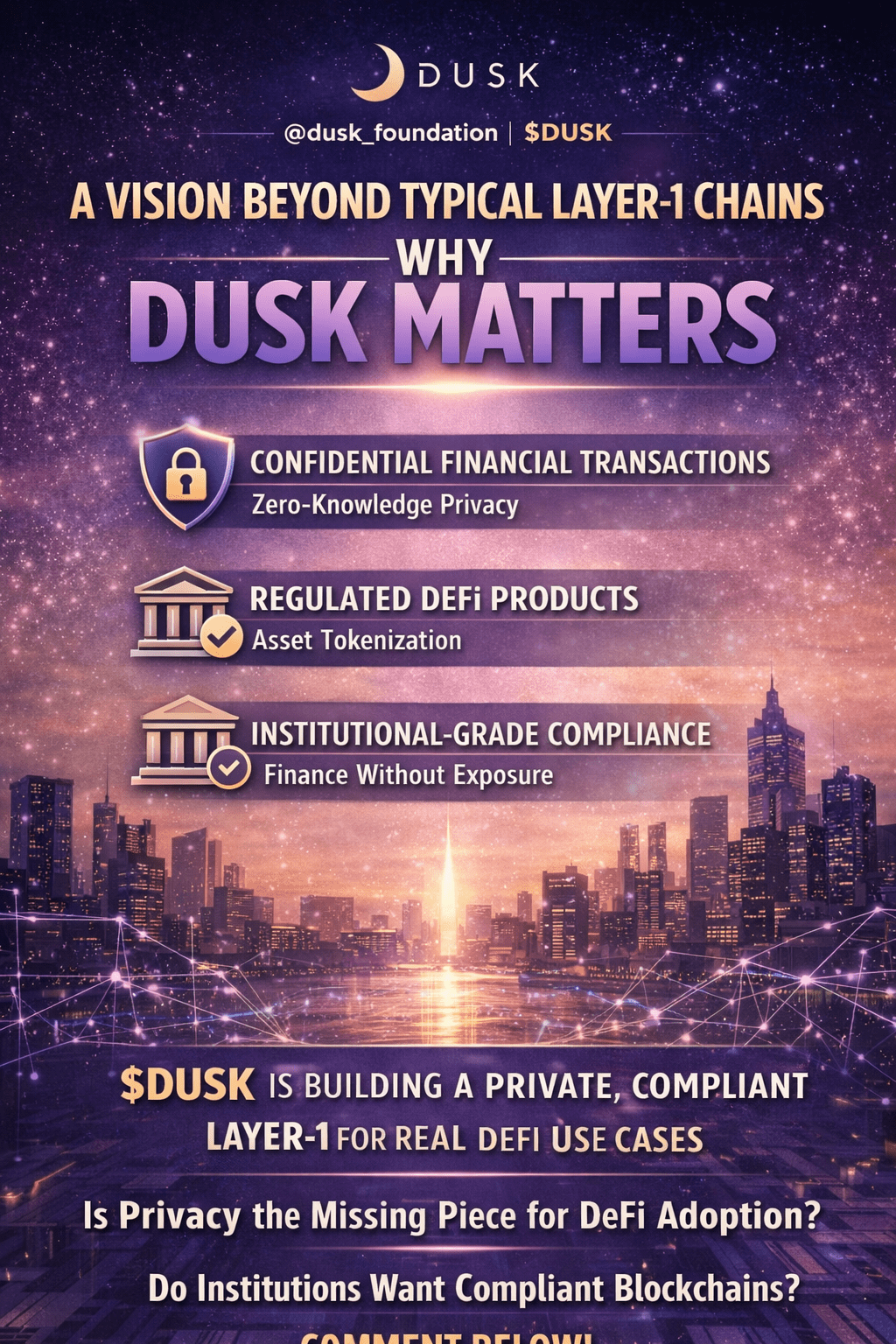 In uno spazio affollato di Layer-1 che si contendono velocità e costi, @Dusk va in una direzione diversa. Piuttosto che inseguire prestazioni grezze, #Dusk affronta un problema molto più difficile: come supportare attività finanziarie reali in catena senza rinunciare alla privacy o ignorare la conformità. Questo focus sembra meno appariscente, ma molto più allineato con la direzione effettiva in cui la blockchain ha bisogno di andare.