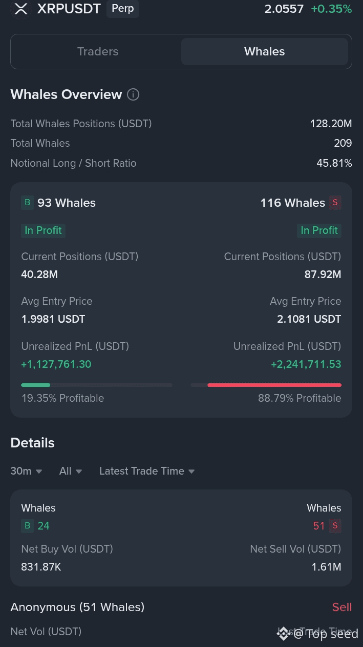 XRPUSDT Perpetual is trading near $2.05, showing little movement on the surface. But whale data tells a very different story.