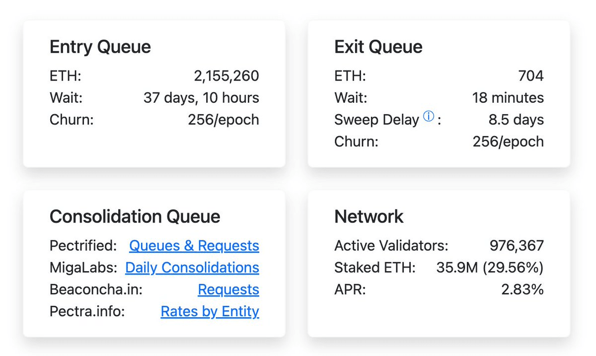 Informazioni sul ritorno alla coda di staking, secondo i dati forniti da https://www.validatorqueue.com/, il numero di ETH entrati nello staking è di 2.155.260 (in attesa di 37 giorni), mentre il numero di ETH usciti dallo staking è di 704 (in attesa di 18 minuti).