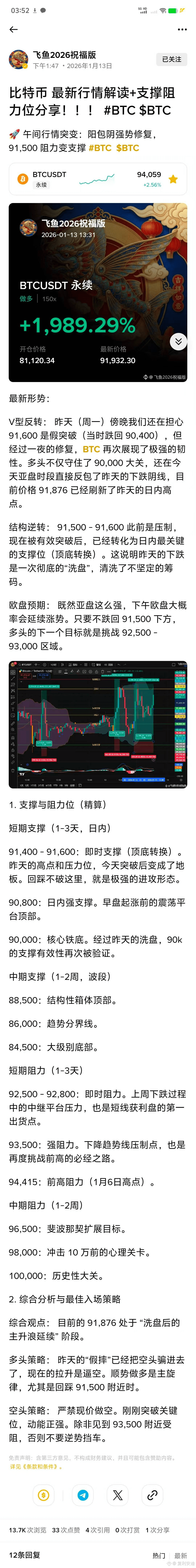 作品亮点:① 时效性强,紧扣当日BTC行情突变的热点,及时解读“阳包阴强势修复”的市场走势;② 干货密集,精准拆解短期/中期支撑阻力位(如91,500顶底转换支撑、92,500短期阻力),给出明确的多空策略;③ 实操性强,结合自身150x做多盈利的实盘案例,增强内容可信度。该作品最终获得13.7K次浏览、33次点赞、12条评论,凭借高互动率和精准的交易价值上榜。