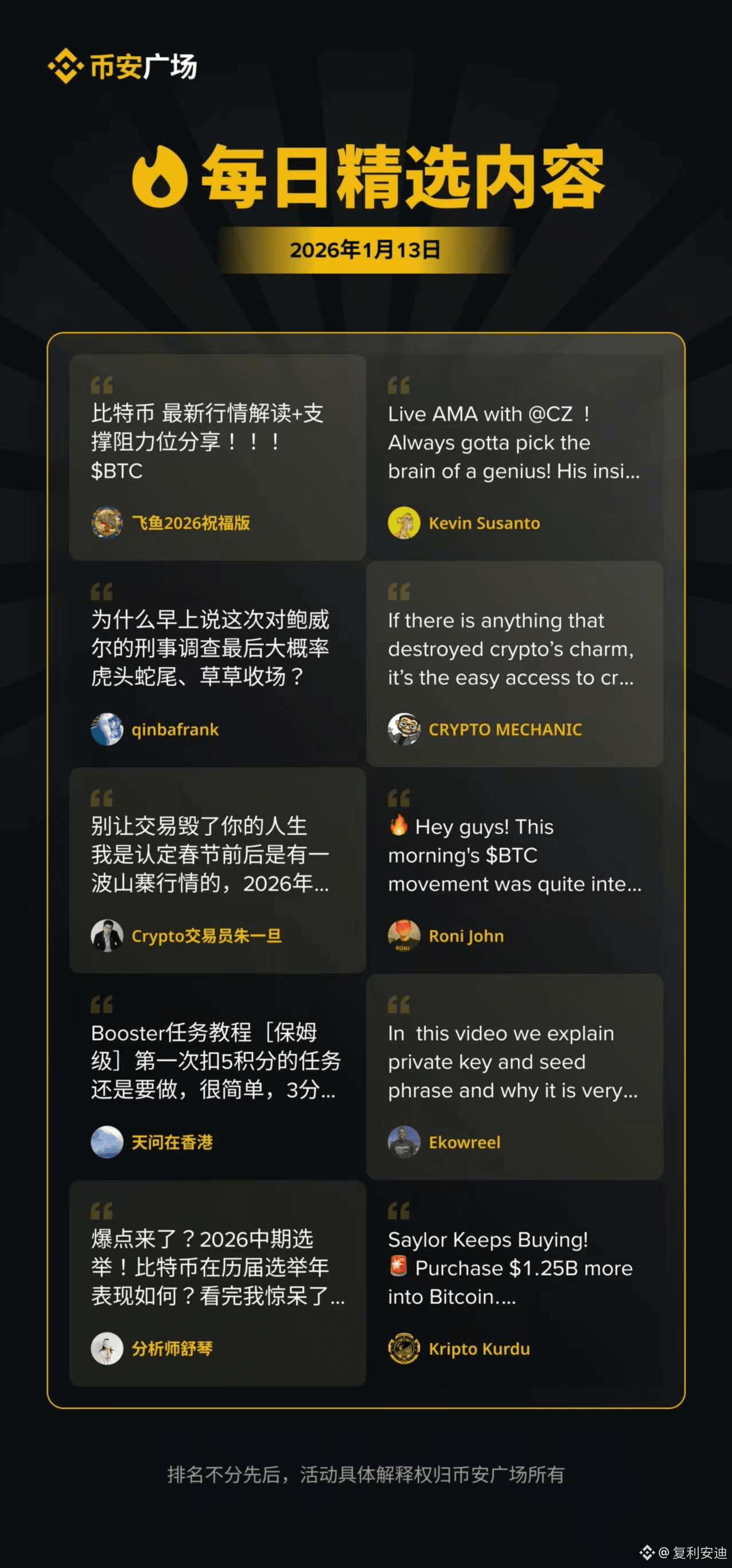 • “普通人做广场有什么信息差?” 他坦言,信息差不在于获取渠道,而在于筛选和转化能力。币安广场有官方公告、行业动态等公开信息,关键是要结合用户需求做“二次加工”,比如把复杂的政策解读转化为普通人能看懂的内容,把行业热点与用户实际操作结合,这才是核心竞争力。