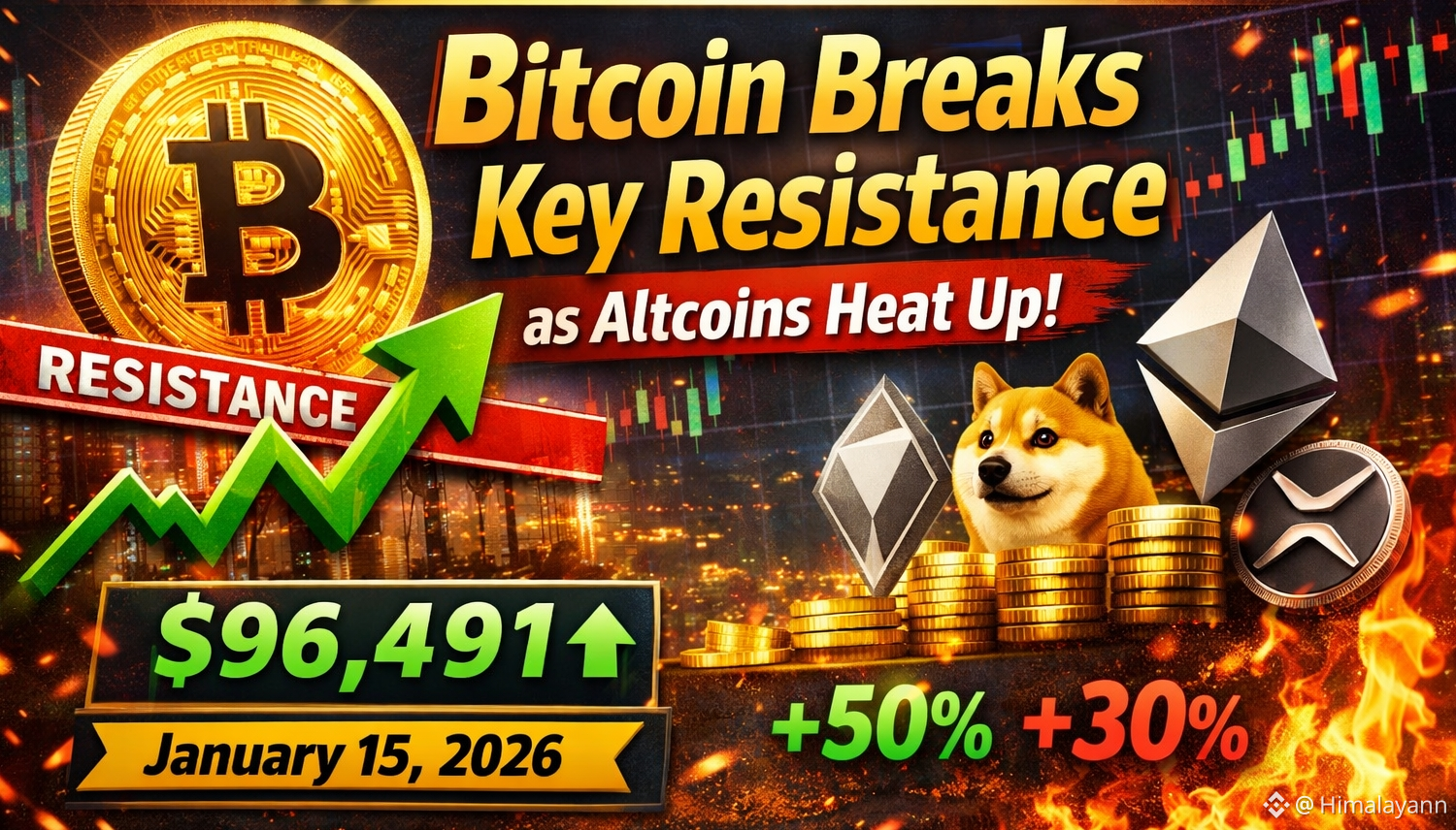 Il mercato delle criptovalute ha iniziato il 15 gennaio 2026 con un forte impulso, poiché Bitcoin ha ripreso livelli chiave e le principali altcoin si sono rafforzate grazie a un sentiment in crescita e al supporto macroeconomico. Secondo gli ultimi aggiornamenti di mercato, Bitcoin ha recentemente superato i 94.500 $, rompendo un'ampia fascia di consolidamento settimanale, un segnale di nuovo interesse degli acquirenti dopo la precedente volatilità.