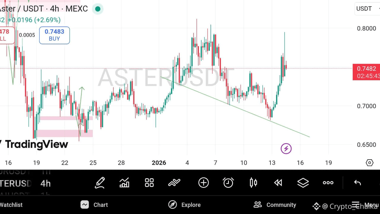 $ASTER sta negoziando intorno a $0,748, mostrando una nuova forza rialzista dopo essersi rimbalzato chiaramente dalla zona di domanda $0,69–$0,71 📈
