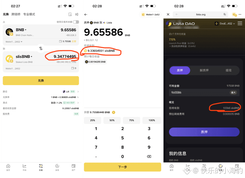 看到了吗?同样是9.65586个 BNB,同一时间,获取到的slisBNB分别为9.34774495、9.33654551、9.3365枚。图1有中间商赚差价,但反而给的最多🙉🙄,真是离谱。