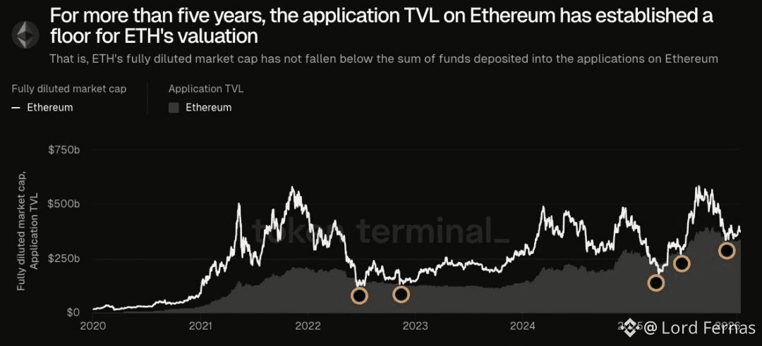 Em cada ciclo, $ETH nunca ficou abaixo do valor total bloqueado em seus aplicativos. Cada queda abaixo disso reverteu. Sem hype. Sem narrativas. Apenas estrutura.
