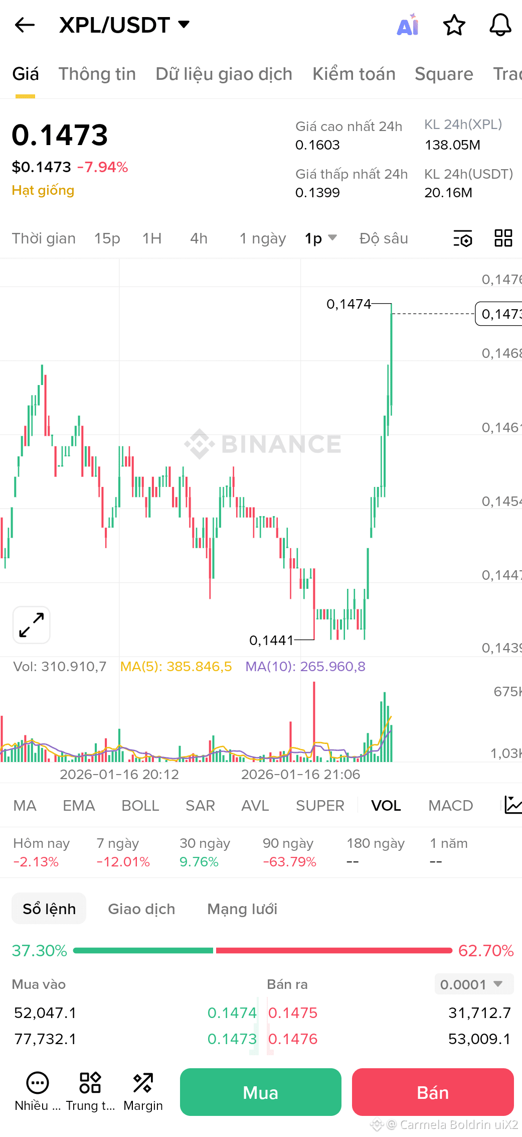 Trước đó giá giảm mạnh, sau đó bật lên rất nhanh từ vùng ~0.144 → 0.1474 (pump ngắn hạn).