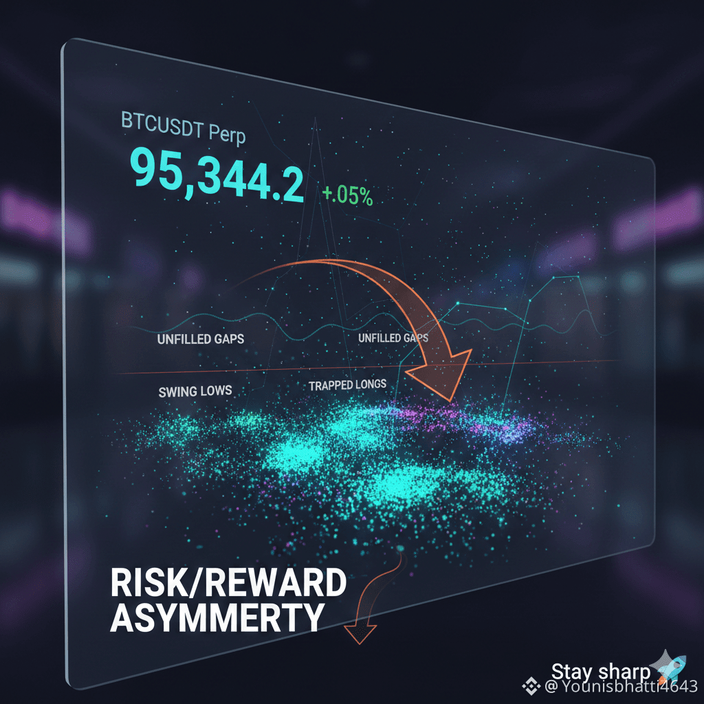 The real depth, the thick pools of resting orders, the clusters of potential fuel — they're stacking below current levels, not stacking up above. Liquidity is quietly accumulating in those lower zones: think unfilled gaps, previous swing lows, and areas where stops and trapped longs from earlier dips still lurk.