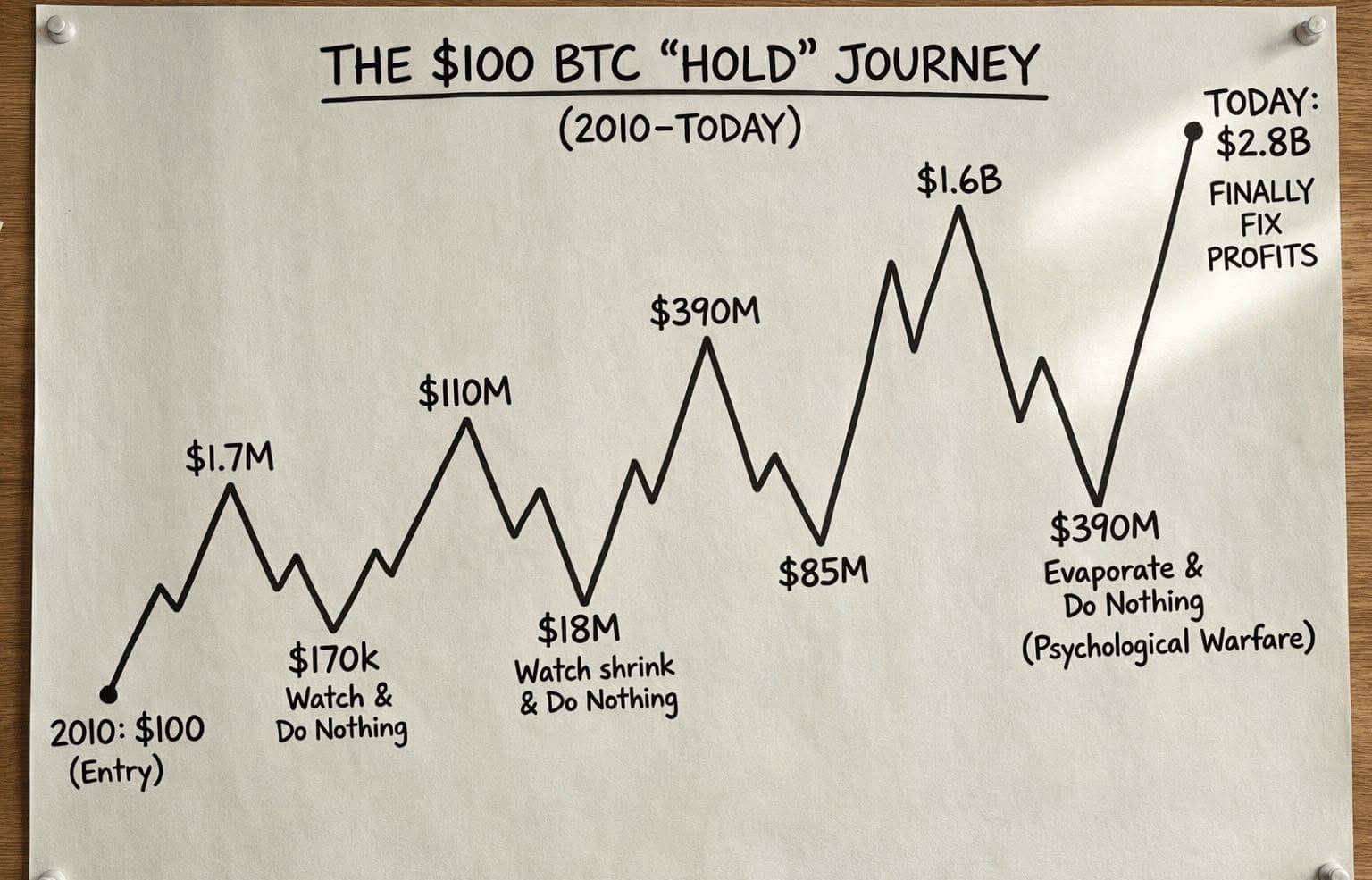 In realtà, quasi nessuno che ha acquistato 100 dollari di Bitcoin nel 2010 sarebbe riuscito a resistere per tutto questo tempo.