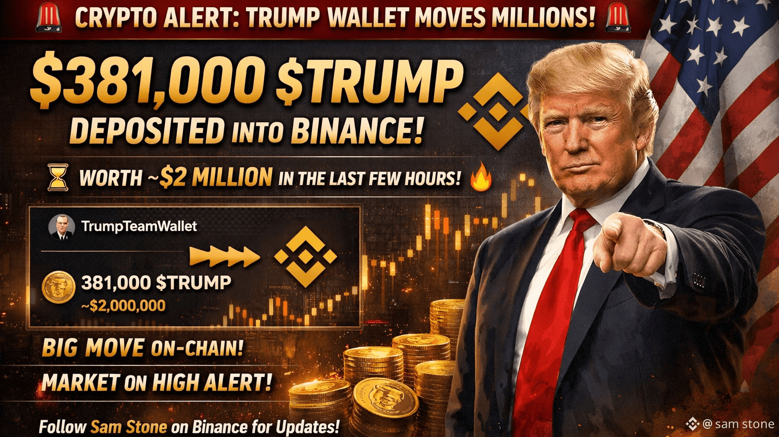 Secondo la piattaforma di analisi on-chain Lookonchain, un portafoglio apparentemente collegato al team Trump ha depositato 381,000 $TRUMP token, del valore di circa 2 milioni di dollari, su Binance nelle ultime ore ⏳🔥