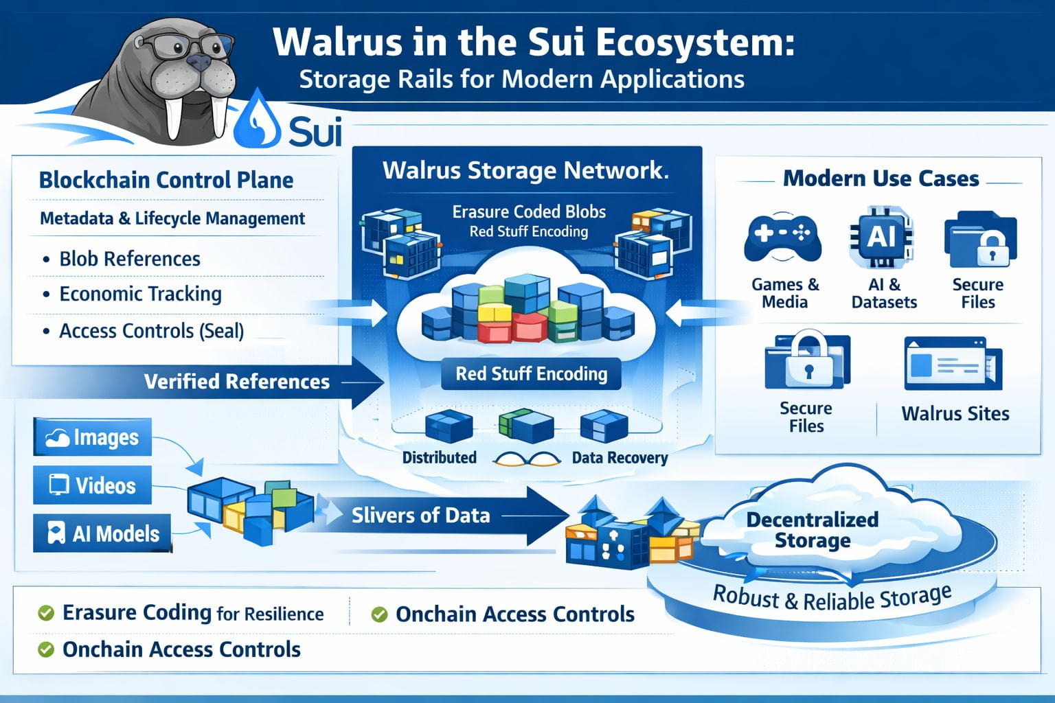 Walrus earns the “rails” framing because it treats storage as something programmable rather than a passive bucket. The design is intentionally split. Sui functions as the control plane: it tracks blob metadata, storage lifecycles, and the economics around who is paying for what and for how long. The big files don’t live on the chain. They sit out on Walrus storage nodes, while the chain keeps the small, important bits that need shared agreement and public visibility. It’s a practical trade: you avoid turning the blockchain into an overpriced hard drive, but you still get references you can verify instead of taking on faith.